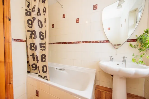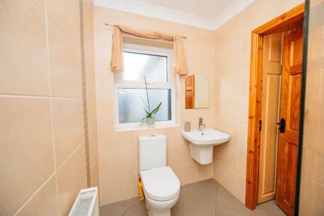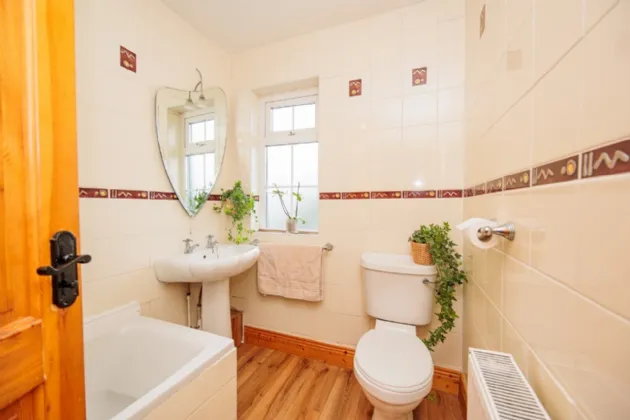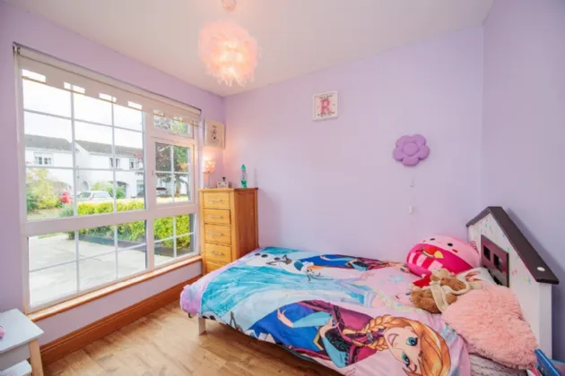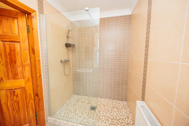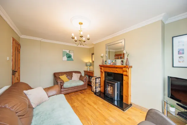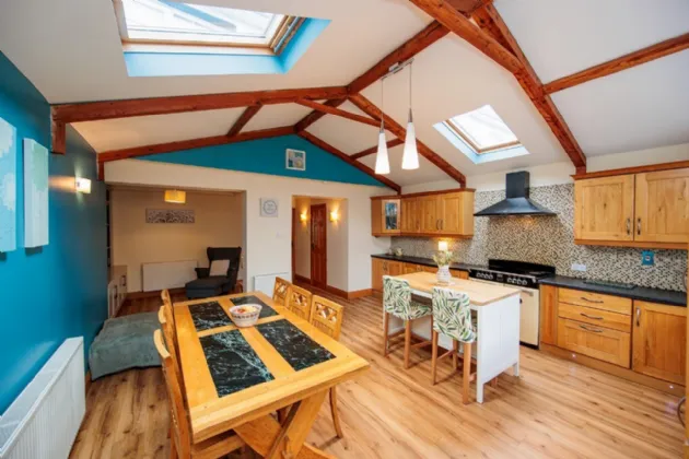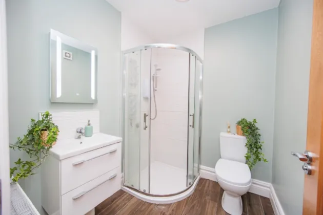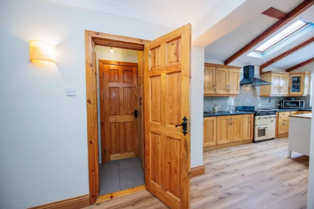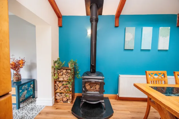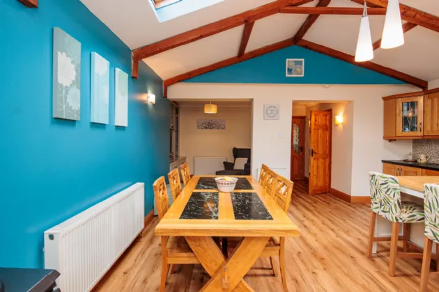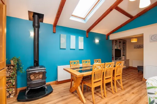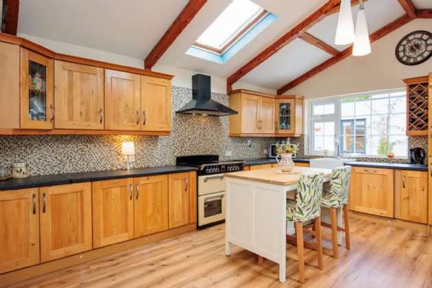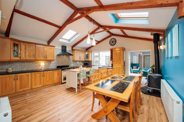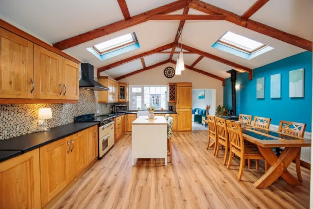 Kitchen / Dining / Family Room 4.99m x 5.04m + 4.33m x 2.38m Impressive and large open plan kitchen/dining/family room which is practical for a growing family. The kitchen area is fitted with Pippy solid Oak wall and floor units with tiled backsplash, Granite effect laminate worktops and Belfast sink. Stoves electric Range Cooker with four ring ceramic hob, two ovens and grill. Belling traditional chimney cooker hood. Hoover integrated dishwasher and larder fridge. Window overlooking the rear garden. Open plan access through to the lounge area. The dining area is spacious and can accommodate a large table and chairs for family dining and entertaining. Waterford Stanley Lismore multi-fuel stove sitting on a black marble hearth. Vaulted ceiling with exposed wooden beams and fitted with two large Velux windows. The family area is fitted a bespoke made floor to ceiling TV unit with underneath storage cupboards and overhead shelving. Ceiling coving and two wall mounted lights. Ranch Oak vinyl plank flooring throughout the kitchen/dining/family room.