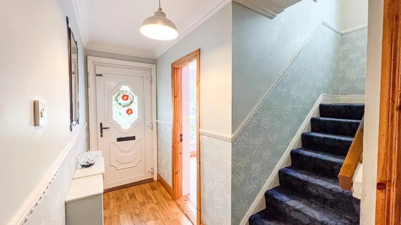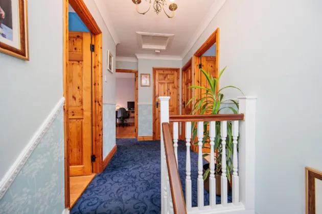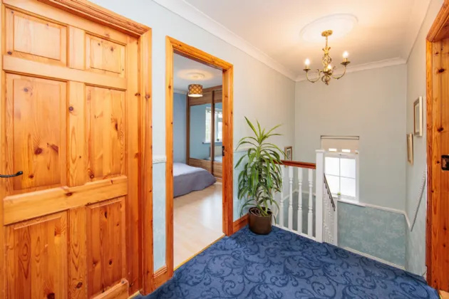 Entrance Hall 3.71m x 1.15m A PVC door front door with stained glass insert opens into a welcoming and bright entrance hall. Solid Oak floor and fitted carpet on the stairs and landing. ceiling coving, centre rose, dado rail and radiator cover. Door to understairs cloak cupboard.