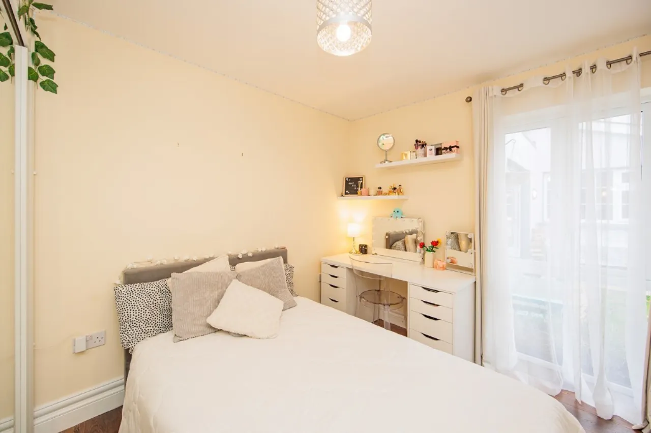 Bedroom Five 2.61m x 3.37m Double bedroom with a tall picture window overlooking the rear garden. Laminate Walnut floor and sliding wardrobes.