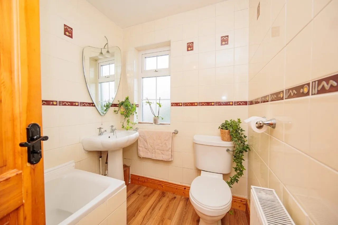 Bathroom 2.01m x 1.87m + 0.67m x 0.42m Comprising a bath fitted with a Triton T9SR pumped electric shower. WC and wash hand basin with a wall mounted mirror. Fully tiled walls. Ranch Oak vinyl plank floor. Frosted window to the rear.