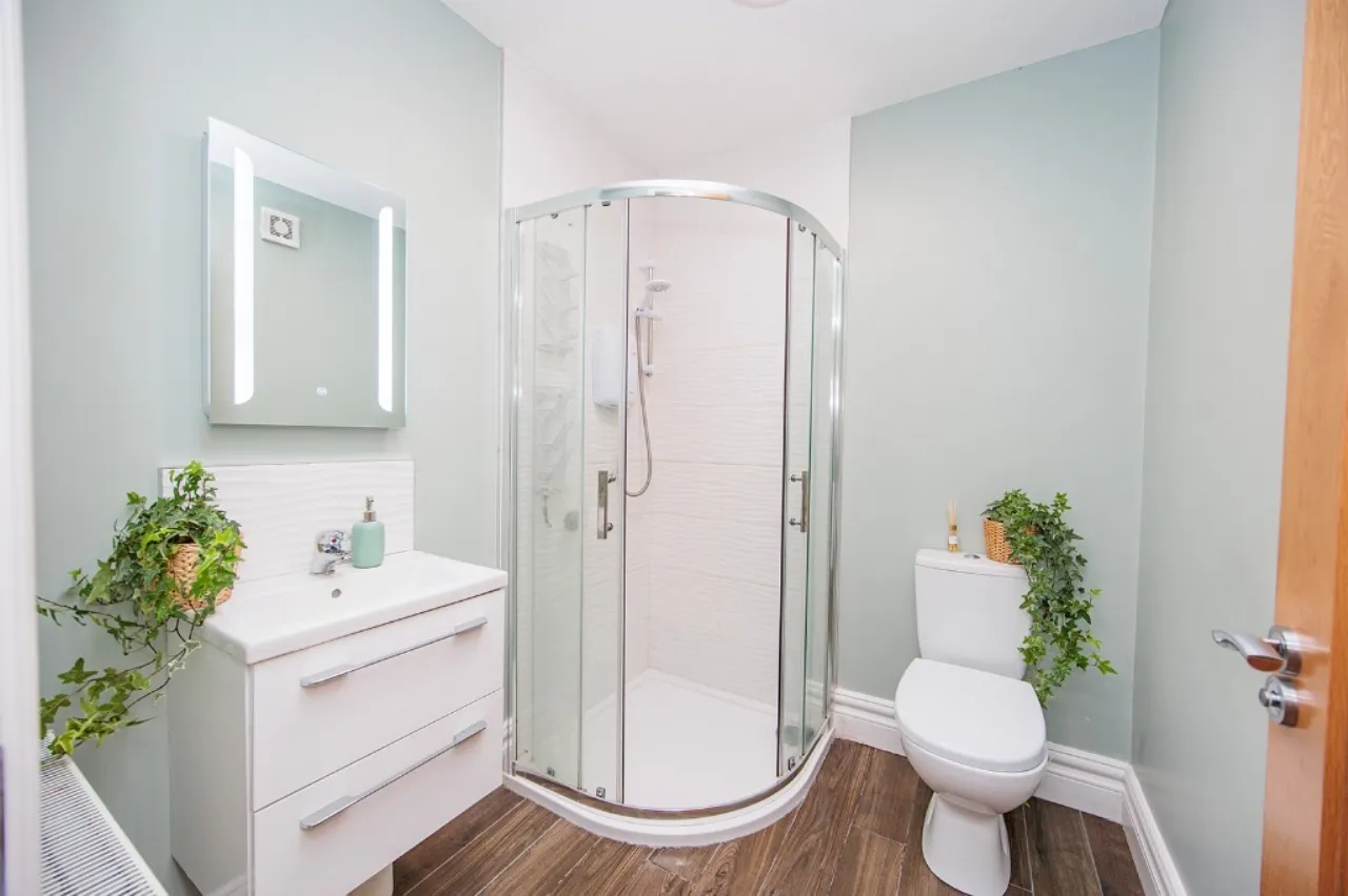 Shower Room 1.77m x 1.99m Enclosed shower cubicle fitted with a Triton T80 electric shower. WC and vanity unit with underneath storage drawers, tiled backsplash and LED wall mounted mirror. Wood effect tiled floor roof light.