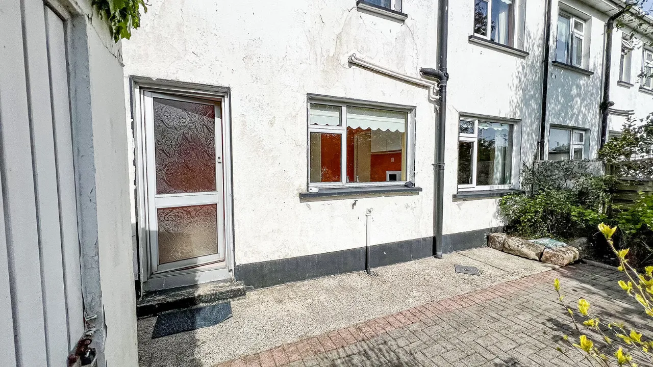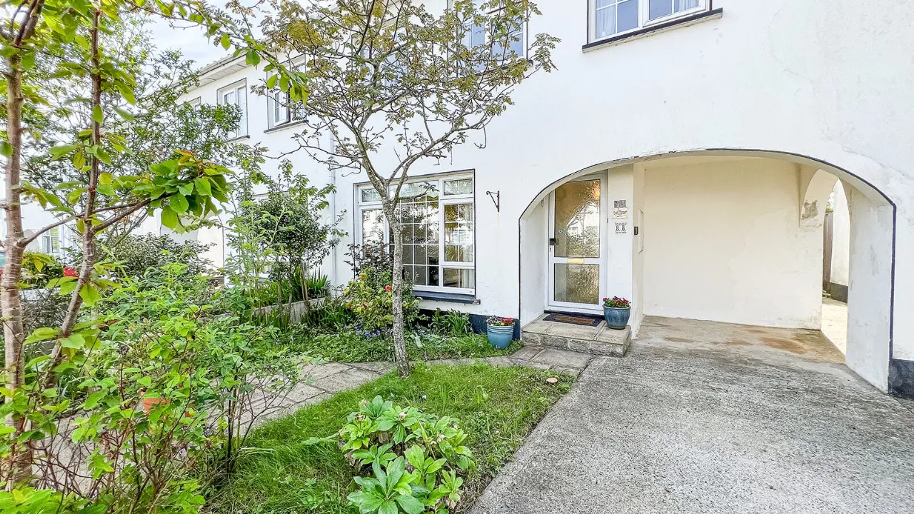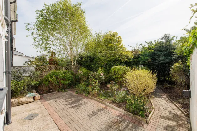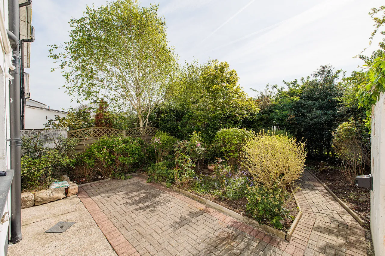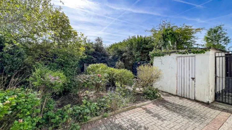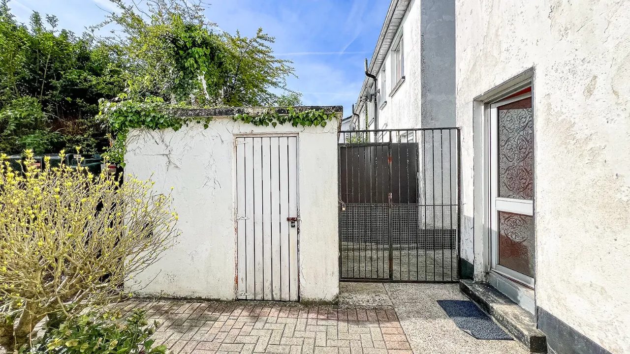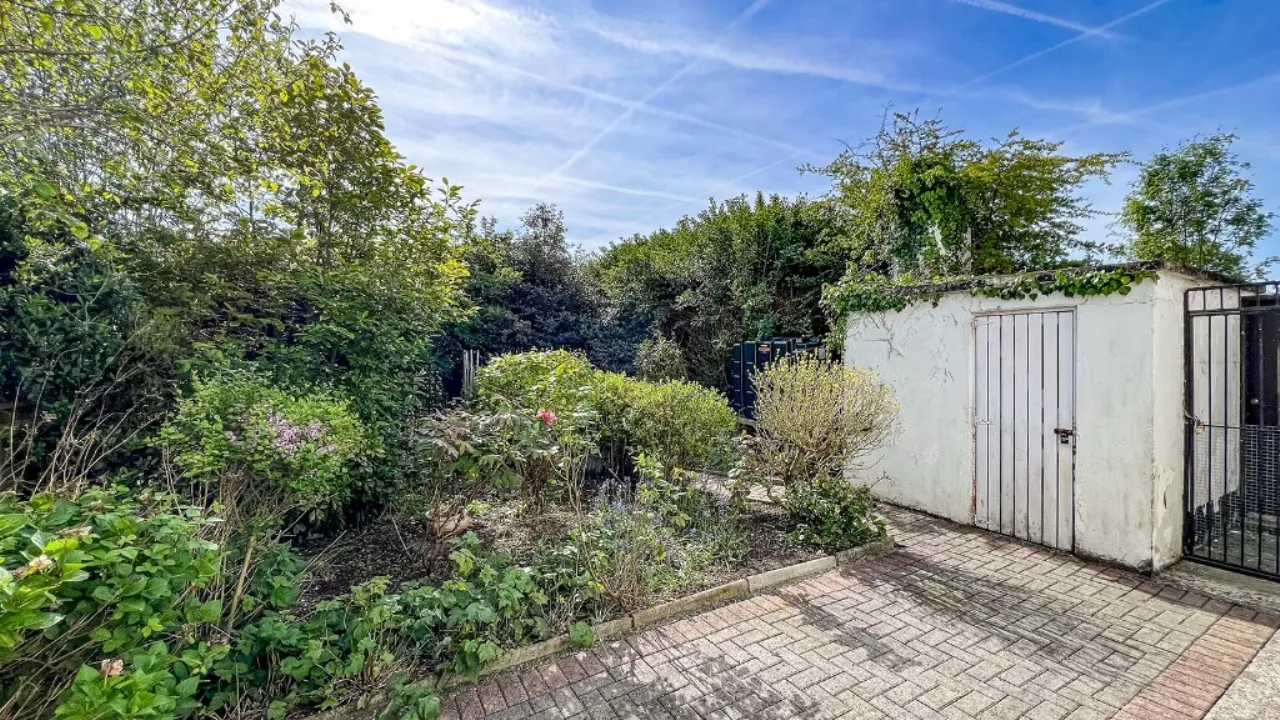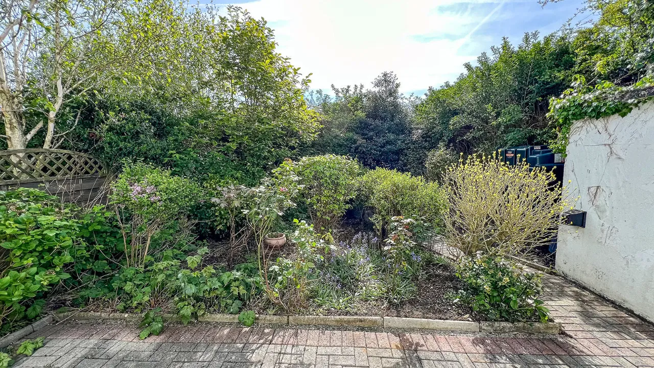 The property features a cobblelock driveway with parking space for two cars. The front garden is, bordered by a boundary wall, and enhanced by a selection of mature shrubs and trees. A gated side entrance provides access to the rear of the property, which includes a storage area to the side. The private rear garden is fully enclosed with a fenced boundary and features mature trees and shrubs, offering a secluded setting that is not overlooked. A cobblelock patio area provides outdoor seating space, while a block-built shed houses the Firebird oil burner.