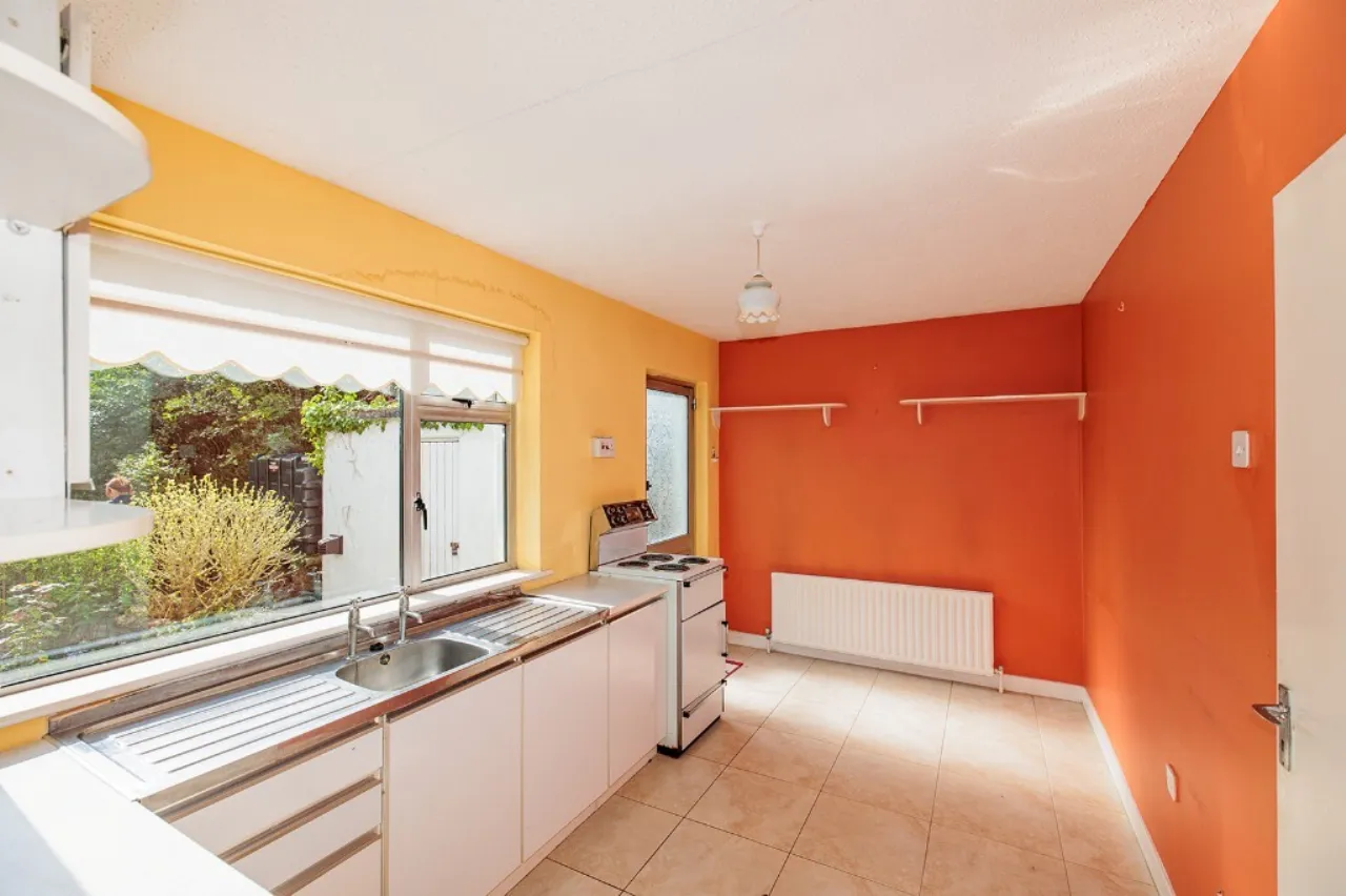 Kitchen 4.26m x 2.41m Located at the rear of the house, the kitchen is equipped with an ESB Chef Extra electric 4-ring hob, grill, and oven, along with a Beko fridge and Power Point microwave. The tiled flooring extends throughout, with a door leading to the living room and a back door providing direct access to the garden.