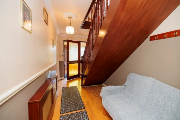 Entrance Hall (including Stairs) 1.92m x 4.28m A Mahogany glass panel door with glass side panel open into a bright and welcoming entrance hall. Wooden flooring and fitted carpet on the stairs and landing. Ceiling coving and centre rose. Dado rail and radiator cover. Coat hanging space under the staircase.