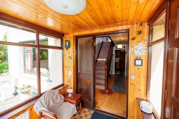 Entrance Porch 1.77m x 2.05m A Mahogany front door with glass side panels open into a sun-drenched entrance porch. Tongue and grooved panelling on the walls and ceiling. Ceramic floor tiling.
