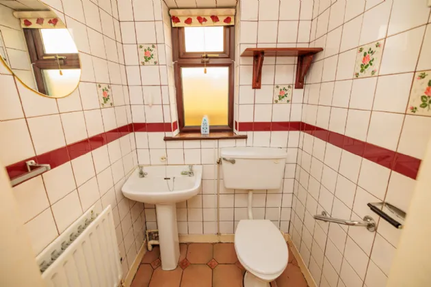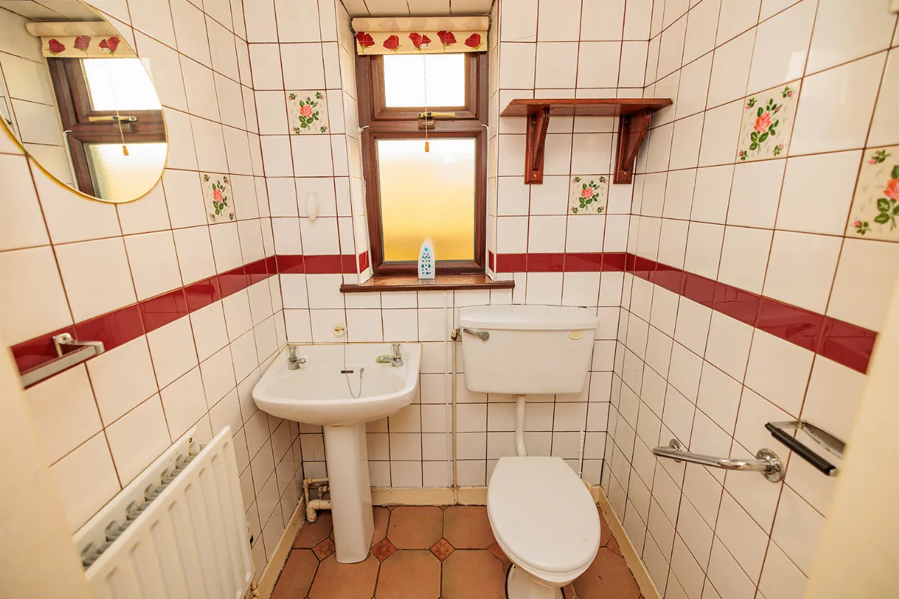 Guest WC 1.43m x 1.22m Comprising WC and wash hand basin. Fully tiled walls and floor. Frosted window to the rear.