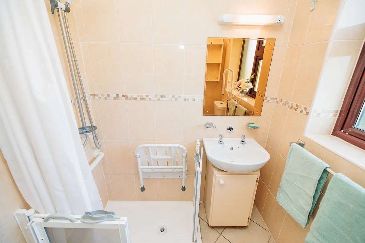 Bathroom 1.91m x 1.64m Comprising a stand-in shower cubicle fitted with a Triton Safeguard Care Pumped Thermostatic Shower. WC and wash hand basin with a wall mounted mirror and shaving light. Fully tiled walls and floor. Frosted window and extractor fan.