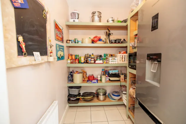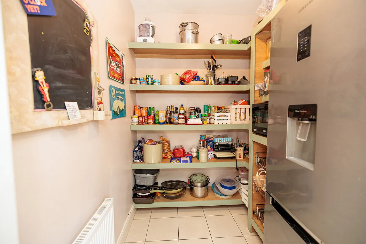 Pantry 1.99m x 1.78m Fitted floor to ceiling shelving with pull-out wire baskets. Space for fridge/freezer. Tiled flooring.