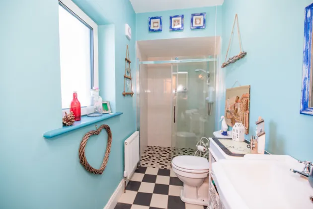 Kitchen / Dining / Family Room 8.05m x 4.77m A large and sun-drenched triple aspect room with lovely views of the gardens and the surrounding picturesque countryside. The kitchen area is fitted with Sage Green wall and floor units with solid wooden countertops and a Belfast sink. Whirlpool integrated dishwasher. Waterford range cooker comprising a five-ring gas hob (bottled gas) and two electric ovens. Breakfast bar with space for up to four bar stools. The dining area is spacious and can accommodate a large table and chairs for family dining and entertaining. A large sliding patio door gives access out to the rear garden. Feature arched south-facing gable end window. Tiled flooring and recessed lighting throughout.