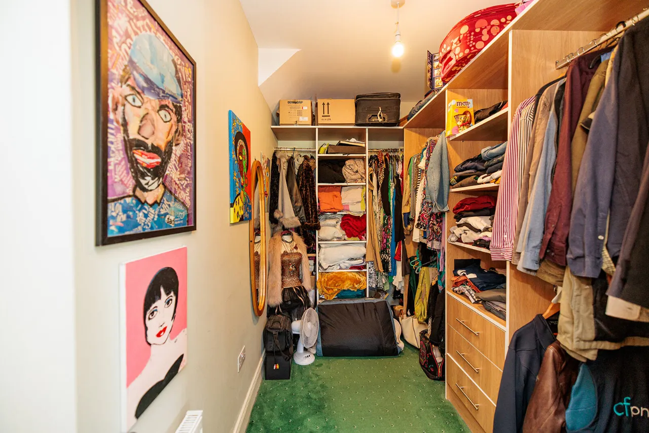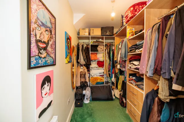 Walk-In Wardrobe 1.88m x 2.95m Built-in hanging space, shelving and storage drawers. Fitted carpet flooring.