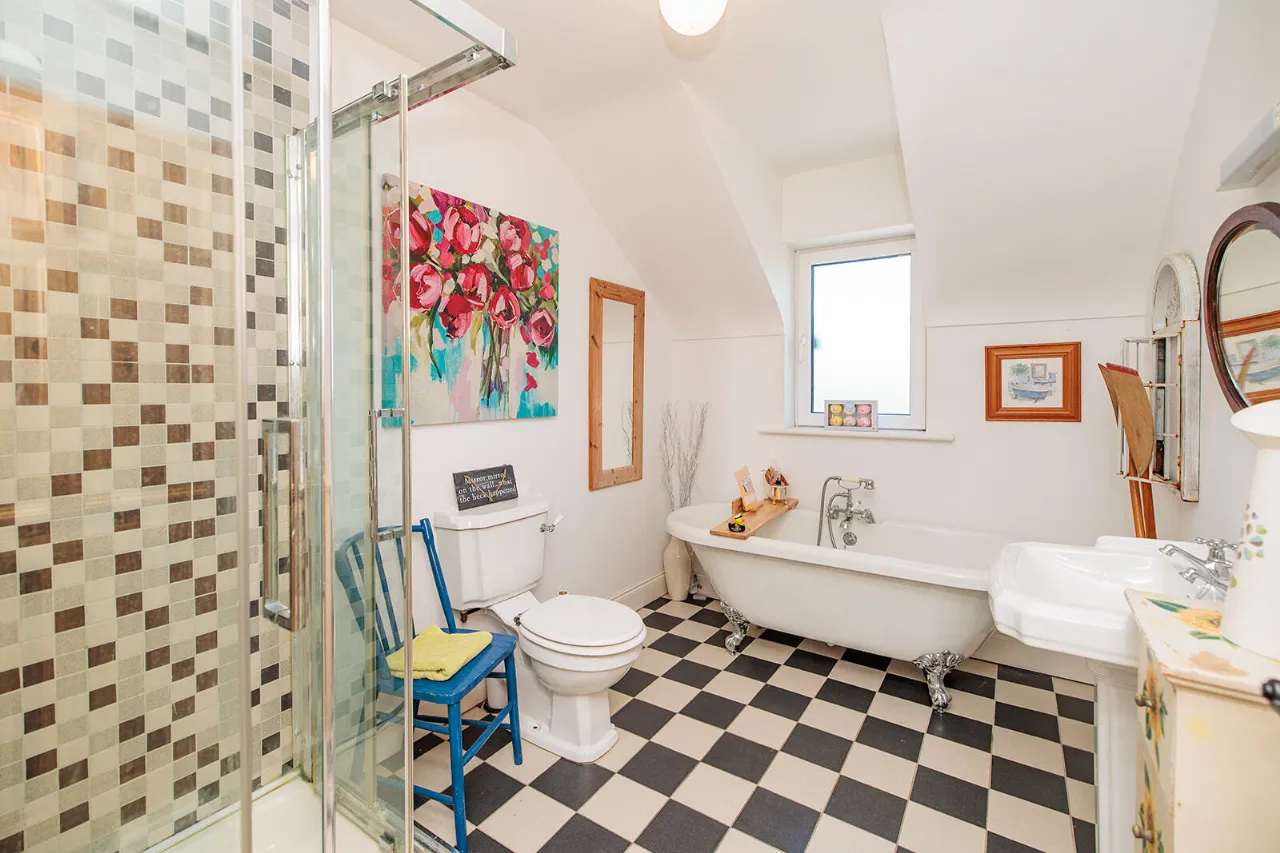 Bathroom 3.09m x 2.21m Comprising an enclosed shower cubicle fitted with a Mira Vigour power shower. WC and wash hand basin with overhead shaving light. Freestanding bath with mixer taps and hand-held shower attachment. Tiled flooring, Xpelair fan and frosted gable end window.