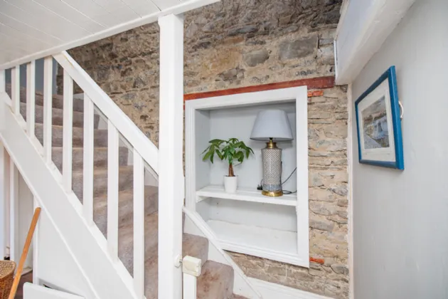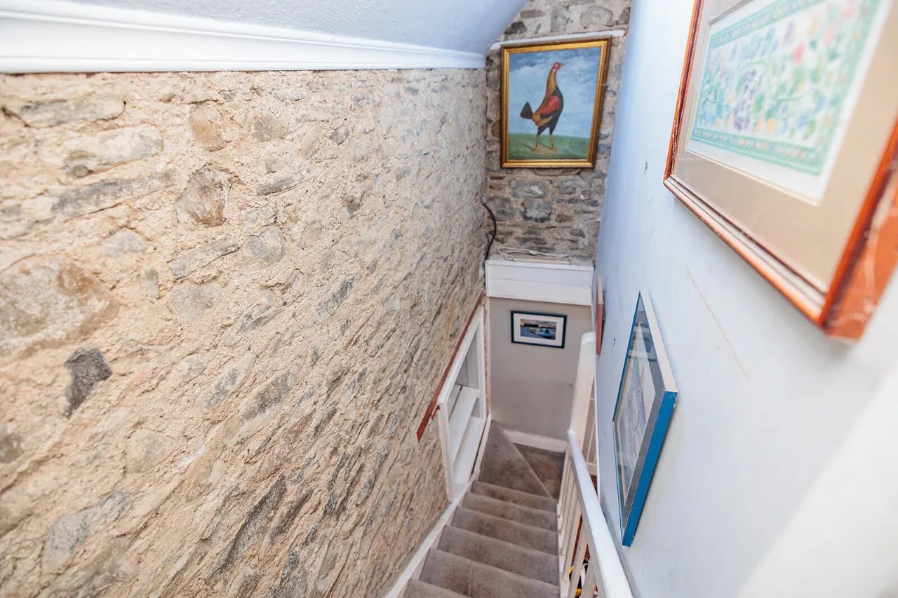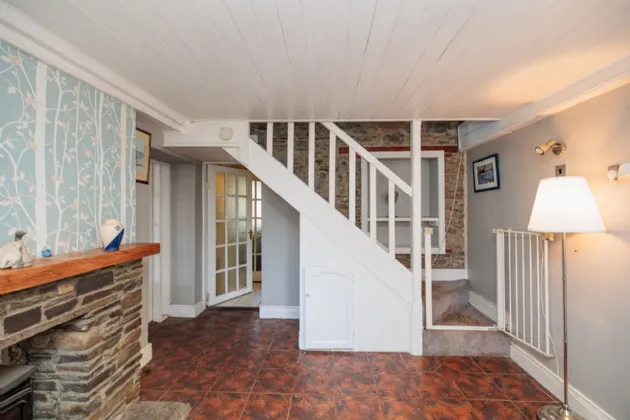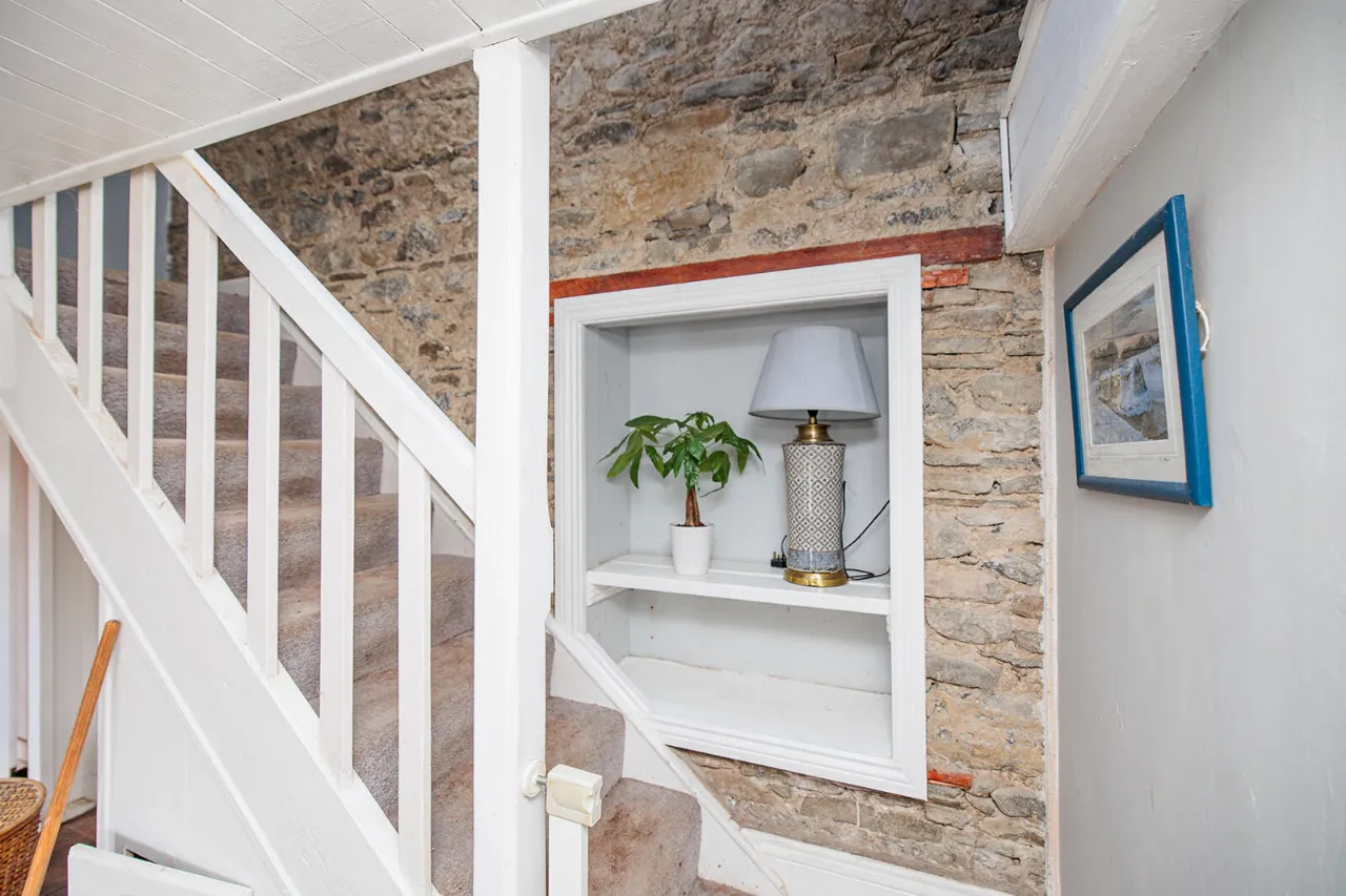 Living Room 3.56m x 4.56m A spacious and bright room with a window to the front of the property. Open fireplace with stone surround, wooden mantlepiece and stone hearth. The fireplace is fitted with a multi-fuel stove. Tiled flooring, wall mounted lighting and painted tongue and groove ceiling boards. Original staircase up to first floor with feature exposed stone wall. Fitted carpet on the stairs and understairs storage.