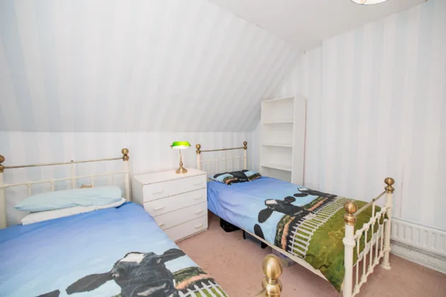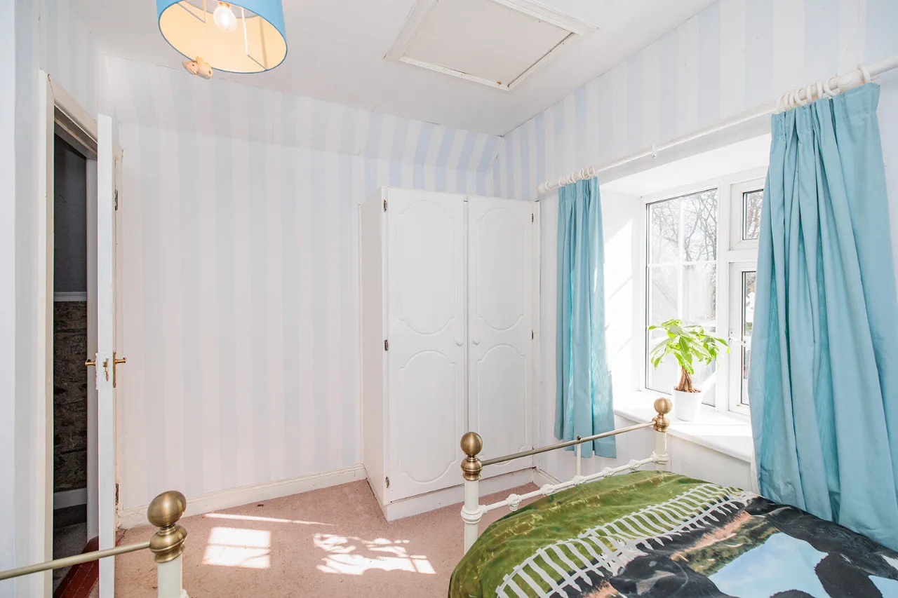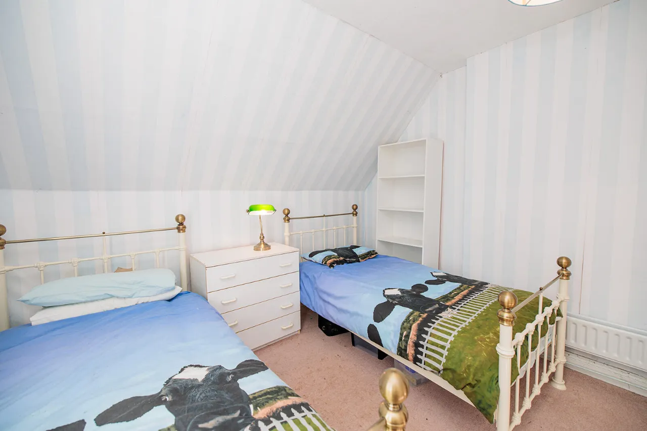 Bedroom Three 3.29m x 1.38m + 3.13m x 1.37m A spacious double bedroom with a large gable end window. Built-in wardrobe and fitted carpet flooring.
