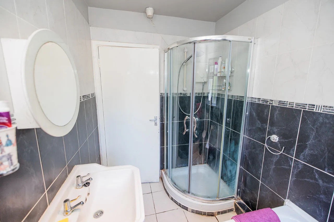 Bathroom 1.72m x 2.50m Comprising a bath with mixer taps and hand-held attachment. WC and wash hand basin. Enclosed shower cubicle witted with a power shower. Fully tiled walls and floor. Frosted window to the rear of the property.