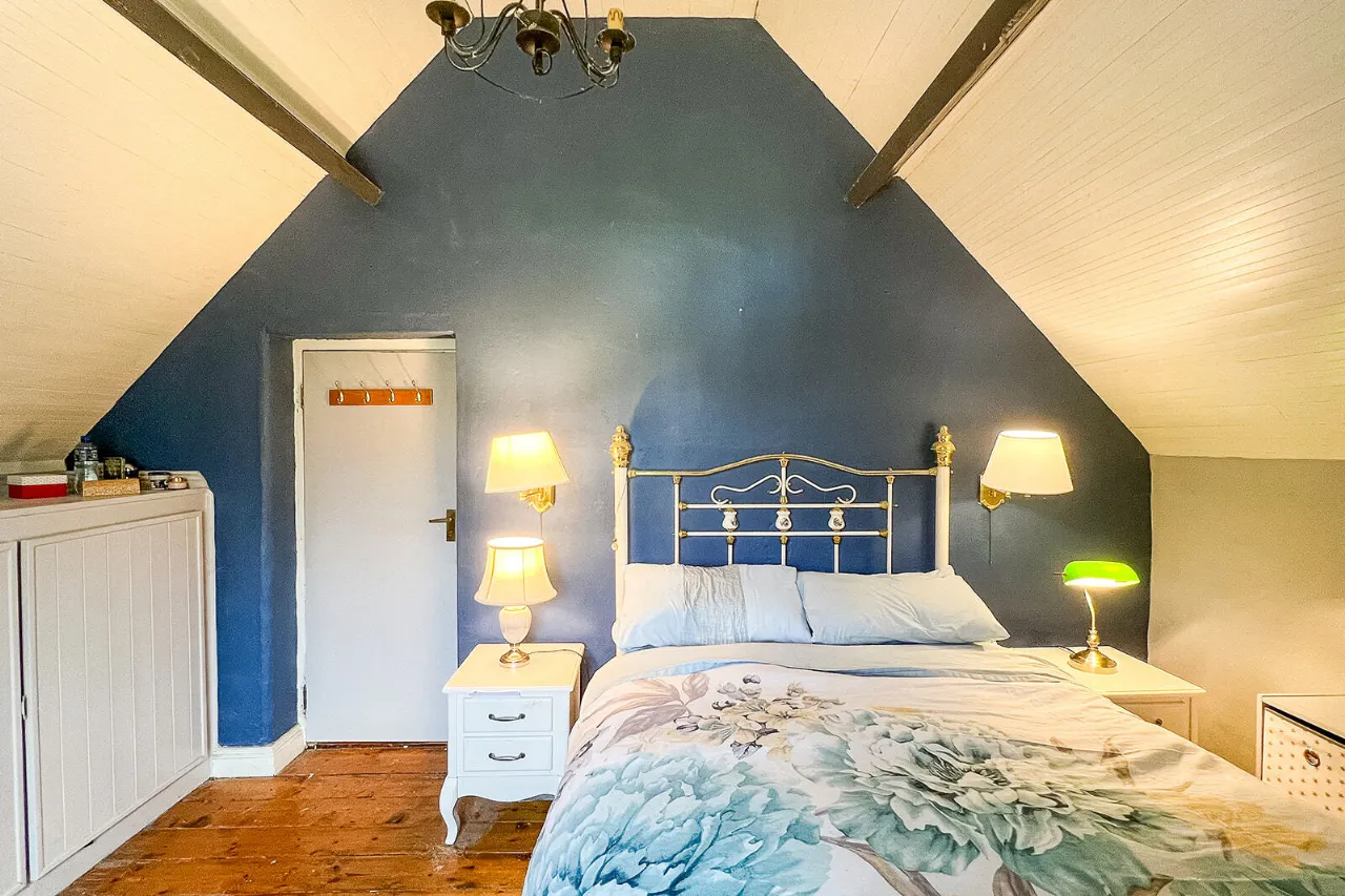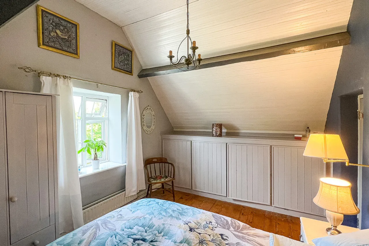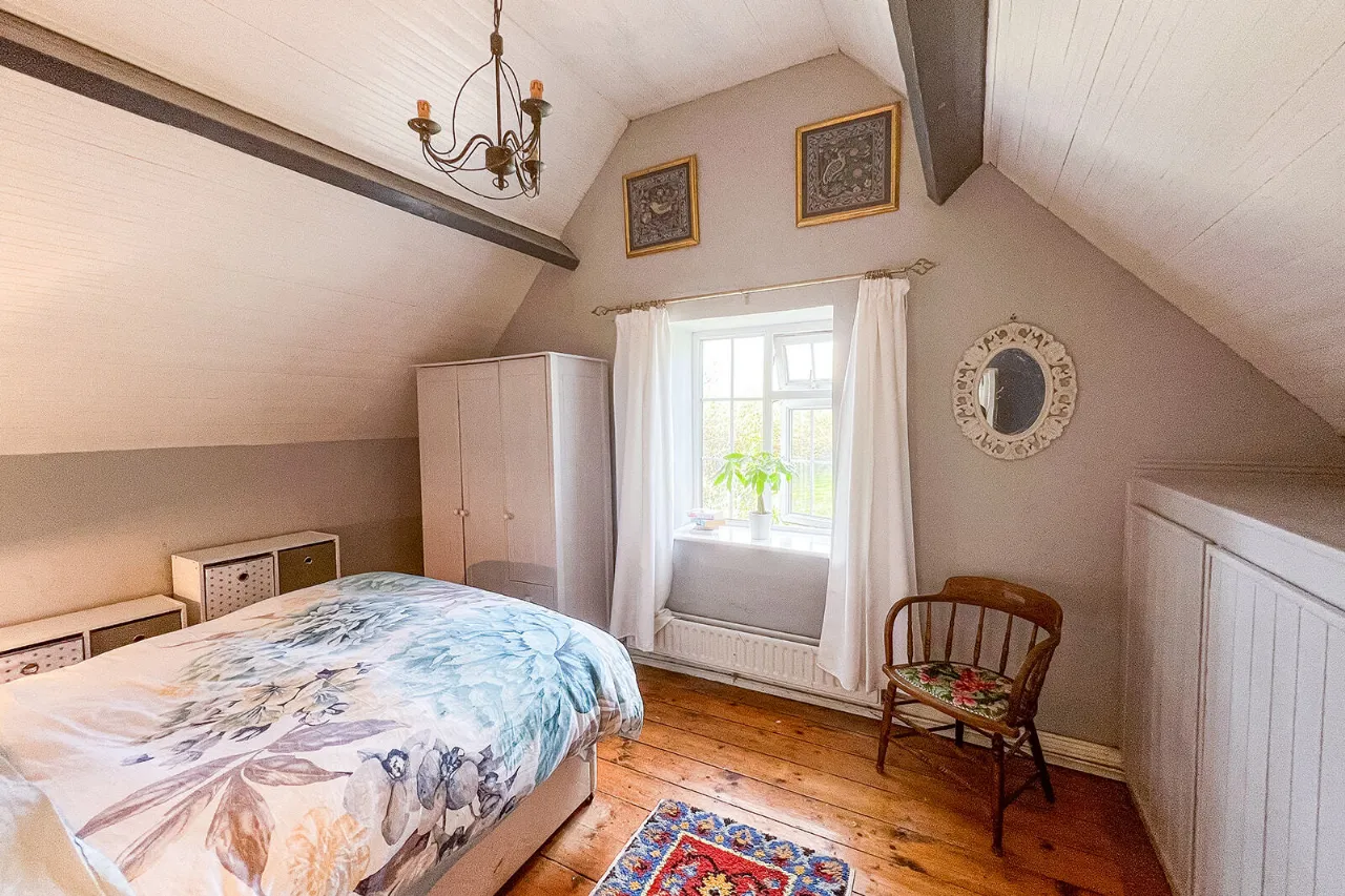 Bedroom Two 3.09m x 4.60m A fine-sized double bedroom with a large gable end window and sloped ceiling with two exposed beams and painted tongue and groove ceiling boards. Built-in cupboards and stained tongue and groove floorboards.