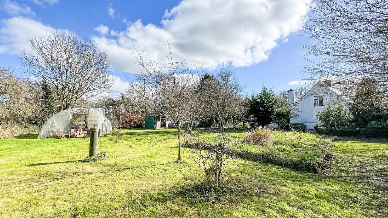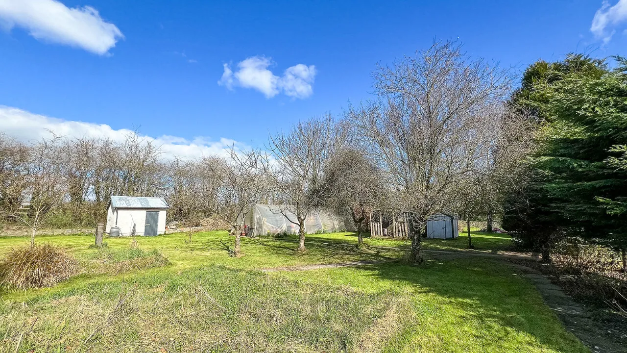 The Lodge sits peacefully on circa 0.75 Acre / 0.3 Hectares of mature and private gardens. An attractive stone wall and piers runs along the boundary line with the road at the front of the property. A wrought-iron pedestrian gate leads up to the front door and wrought-iron vehicular gates give access to a gravelled parking area. The secluded gardens are laid in lawn bordered by a stone wall with mature hedging, trees and herbaceous planting. The grounds contain a detached garage with overhead loft space, block built pumphouse and a Polytunnel.
