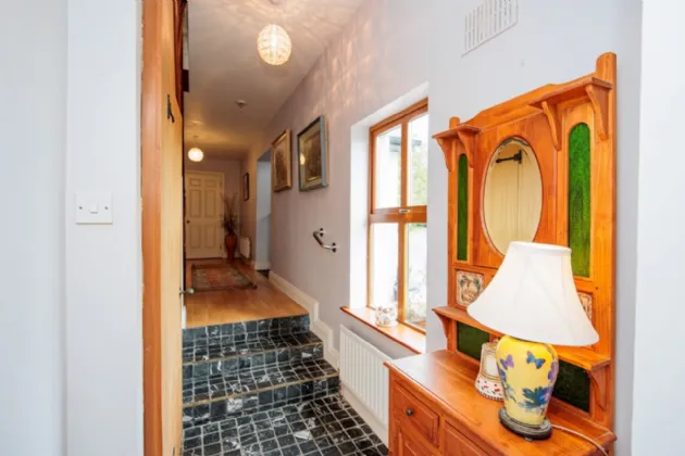 Entrance Hall (including stairs) 8.17m x 2.08m A spacious area with views of the front garden and paddocks. Staircase to first floor. Wooden floor with two steps down to a lower level which is tiled including the steps.