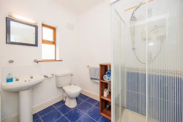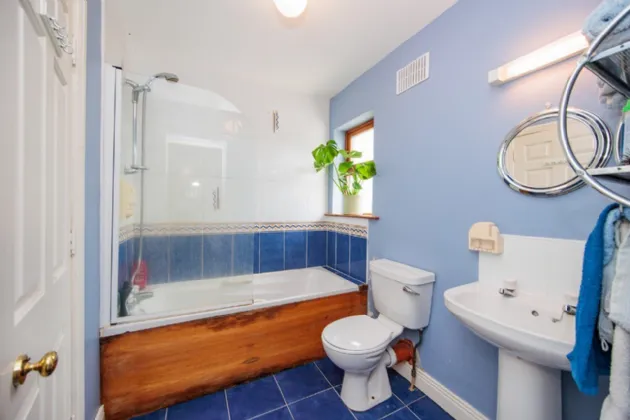 Jack & Jill Bathroom 2.31m x 1.77m Comprising a bath with overhead shower and glass bath screen. WC and a wash hand basin with tiled backsplash and overhead shaving light. Frosted south facing window to the rear. Tiled floor. Door to bedroom four.