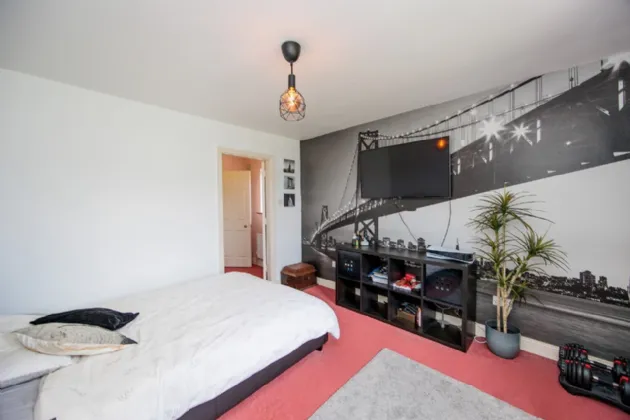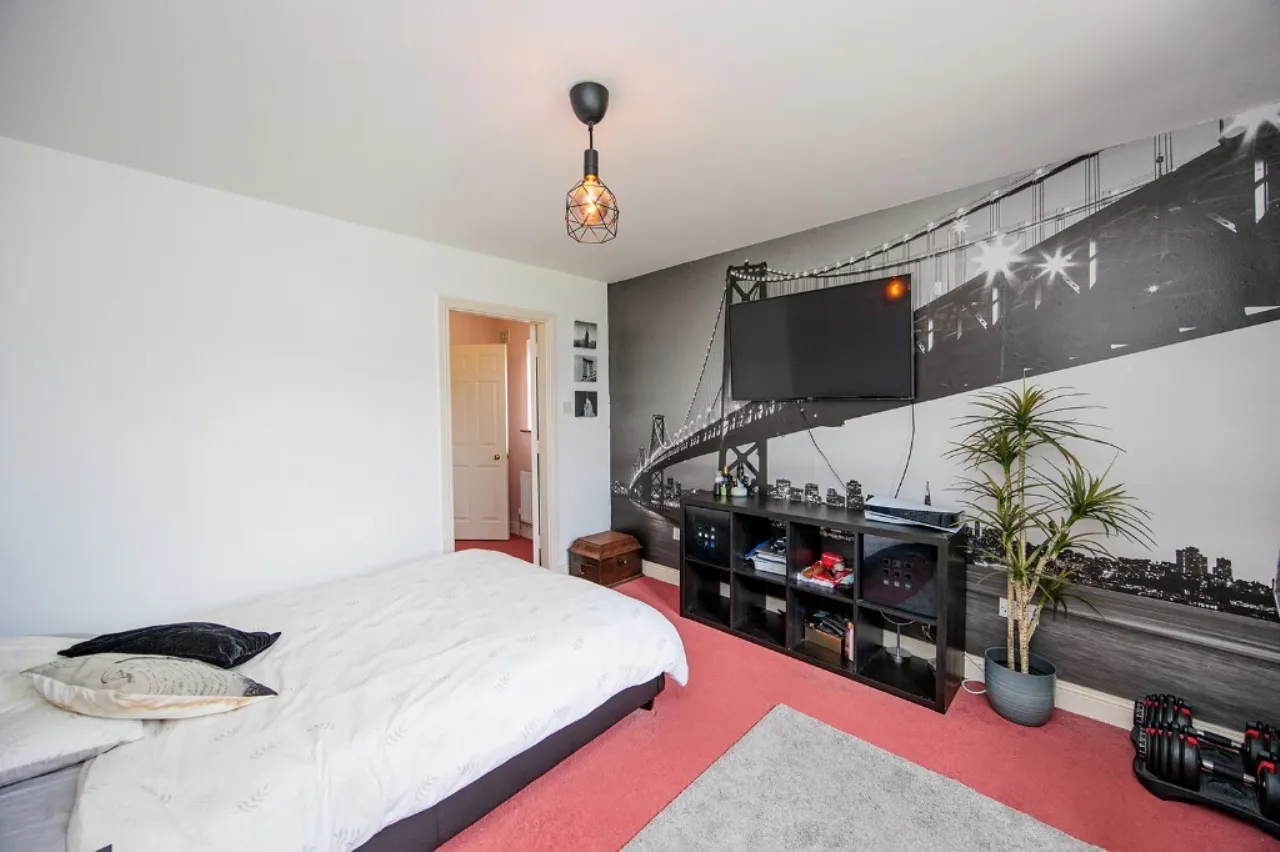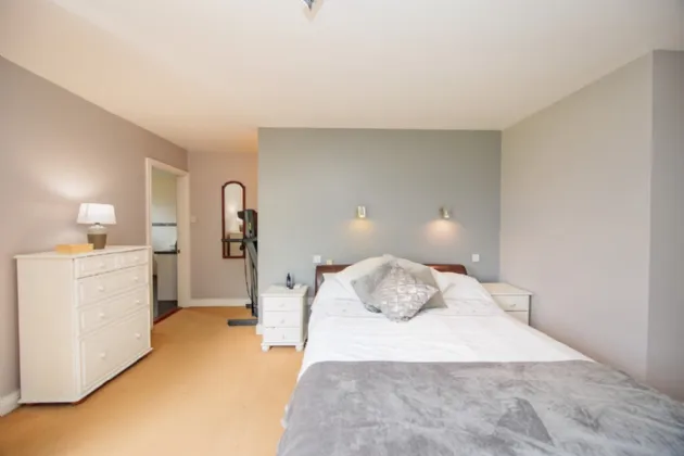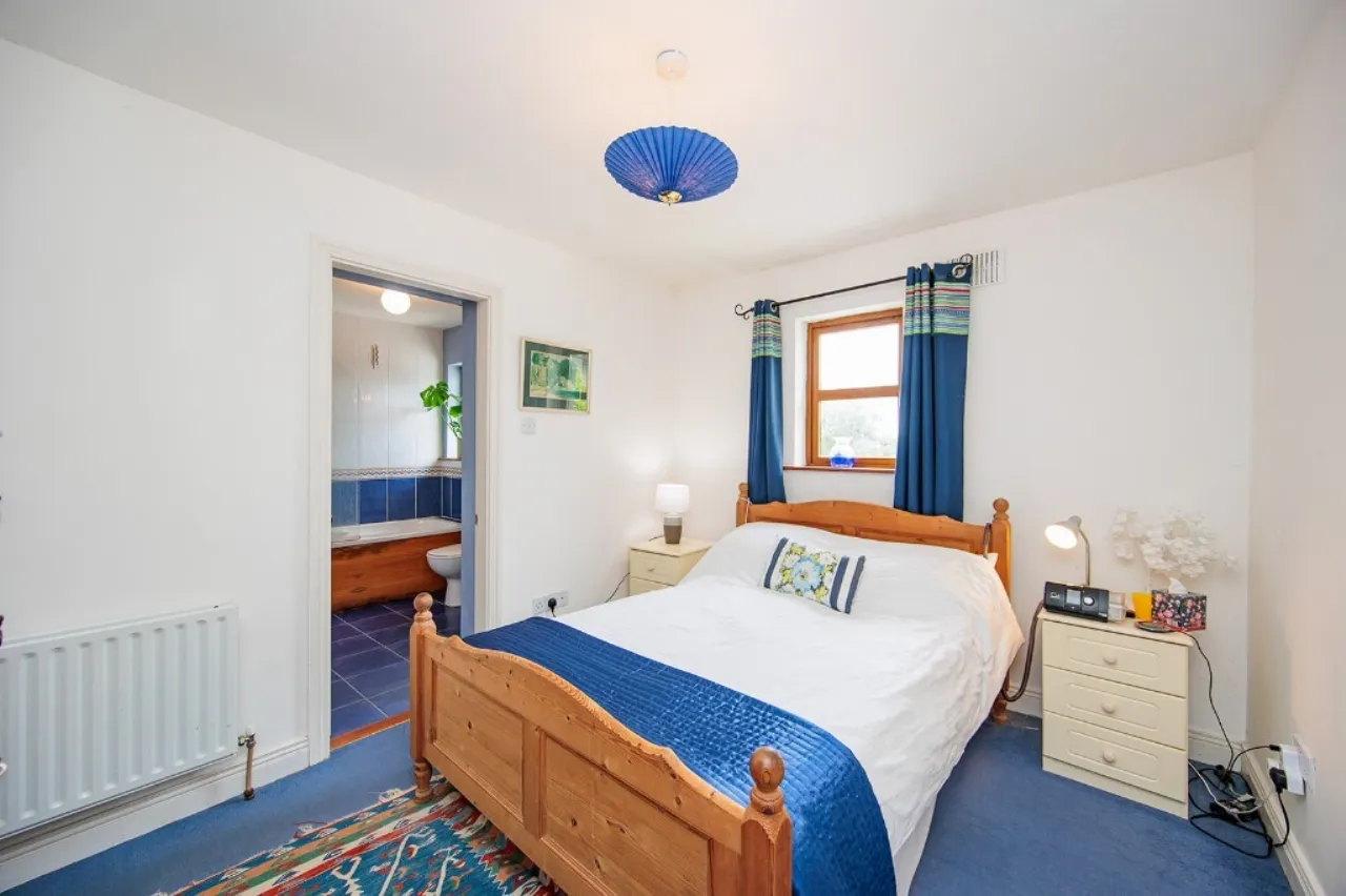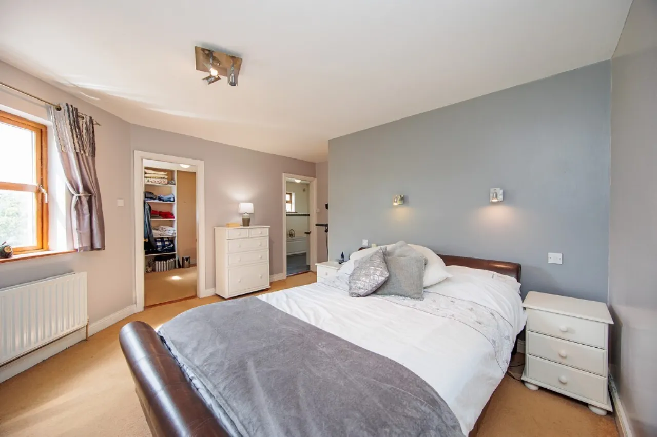 Master Bedroom 1.84m x 0.97m + 3.30m x 0.89m + 3.97m x 1.59m + 3.24m x 1.84m + 1.76m/2 x 1.76m A fine sized master bedroom with a sunny south facing aspect. Fitted carpet and wall mounted lighting over the bed.