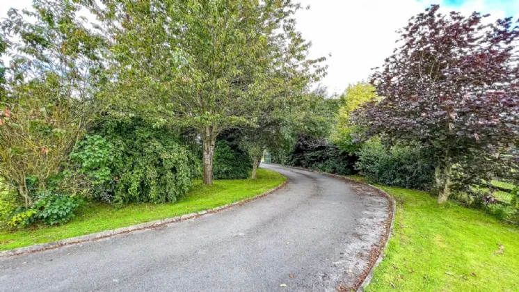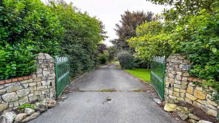 The property is well set back from the road and is accessed through a curved stone vehicular entrance with wrought-iron electronic gates. A timber post and rail fence with a Beach hedge runs along the boundary line with the road. A sweeping tarmacadamed driveway is flanked by manicured lawns bordered by mature trees, hedging and herbaceous planting. There is parking to the front, side and rear of the property for several cars.