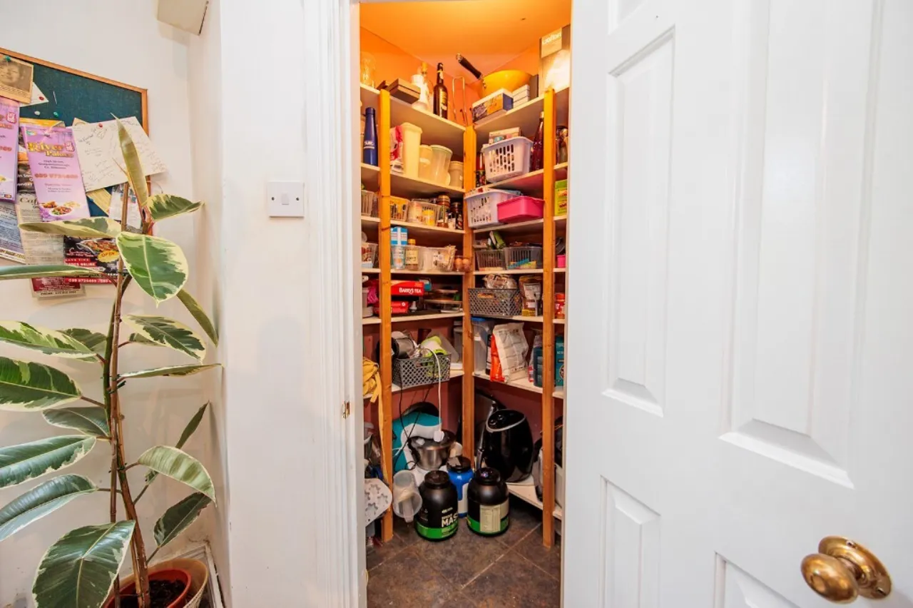 Pantry 1.32m x 0.57m + 1.32m + 0.56m/2 x 0.78m Fitted shelving and tiled floor.