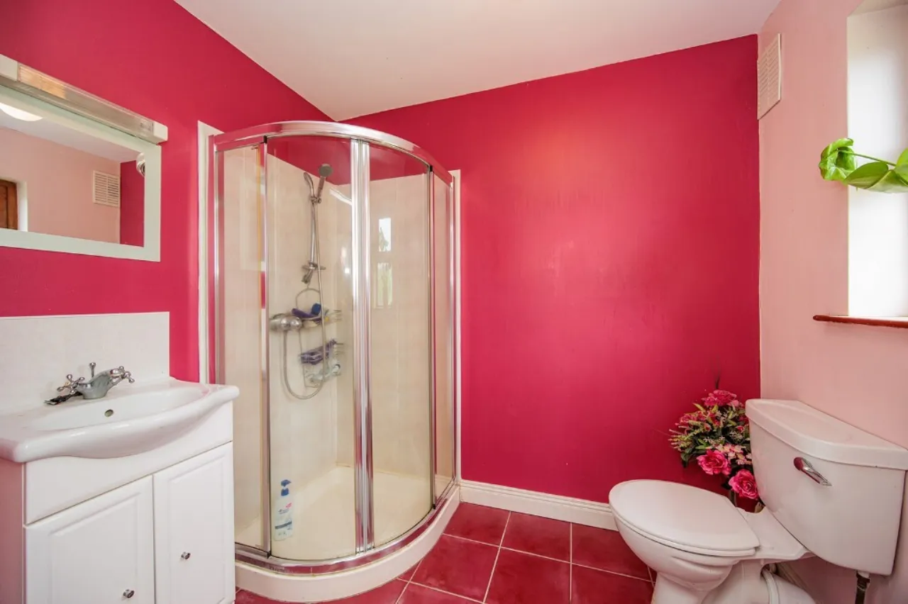 En-Suite Comprising a stand-in shower cubicle fitted with a Mira Excel shower, WC and a wash hand basin. Tiled floor.