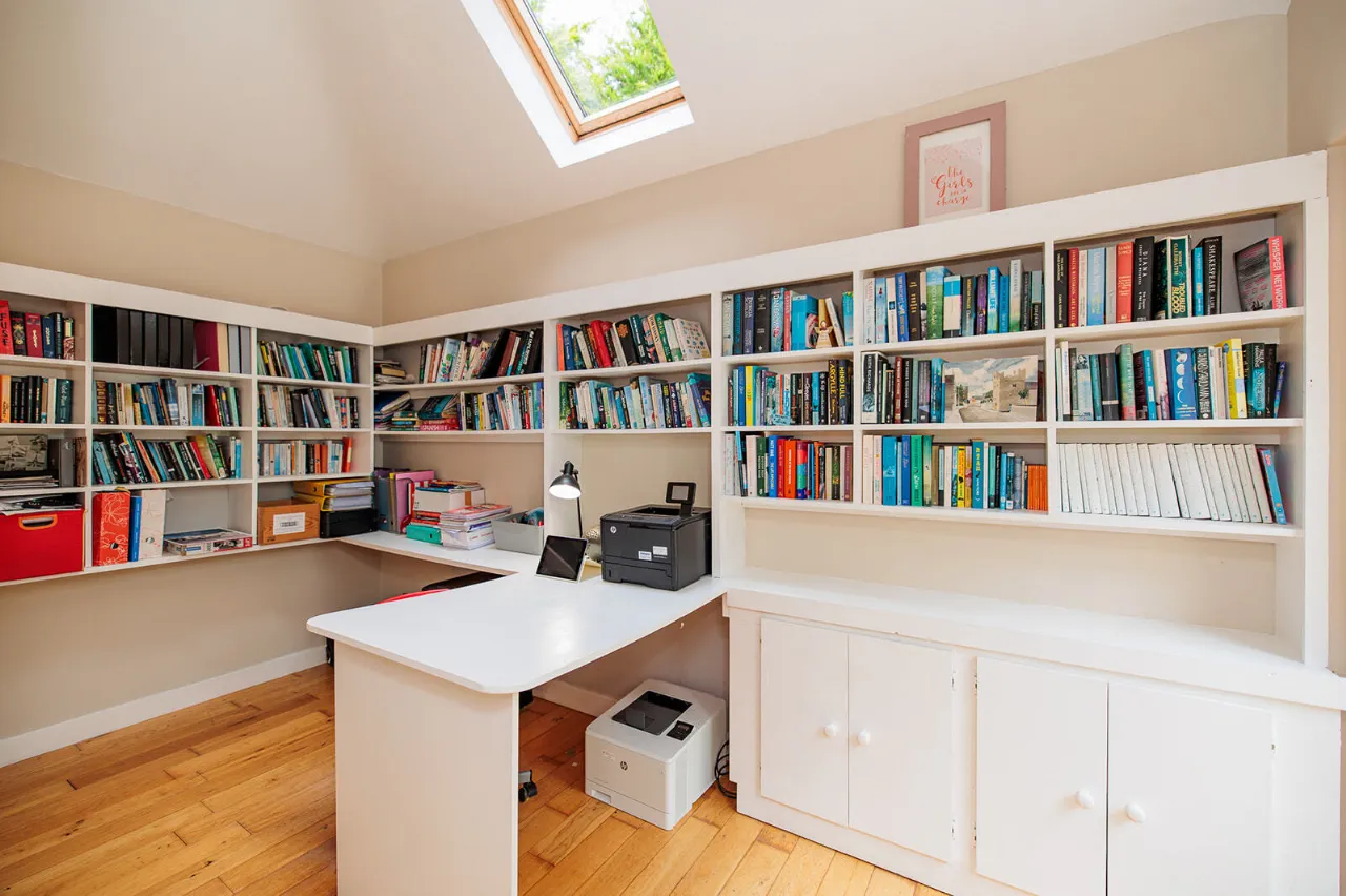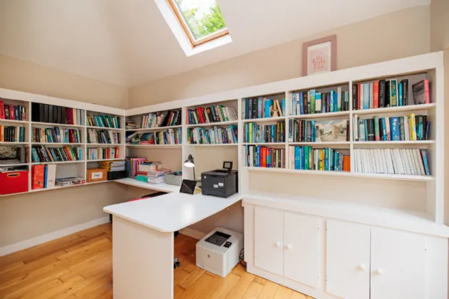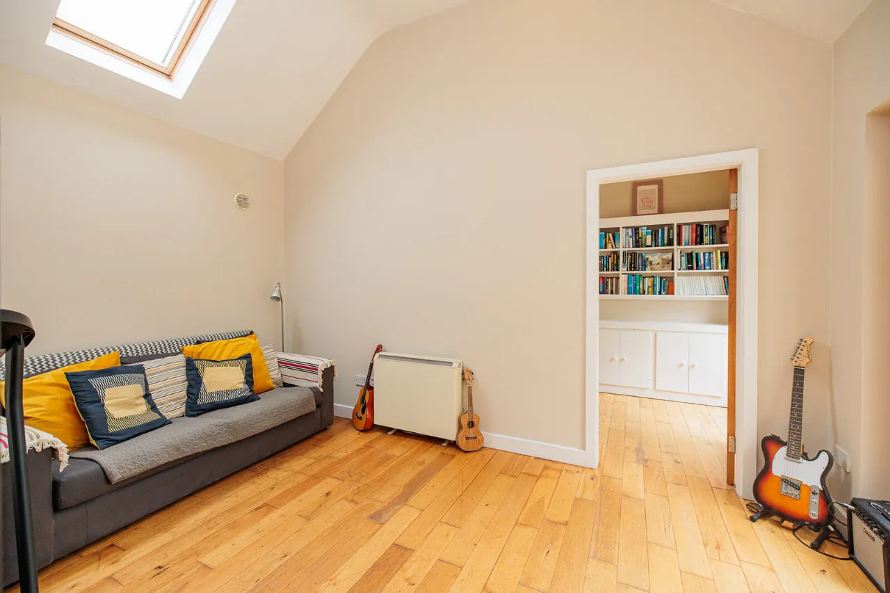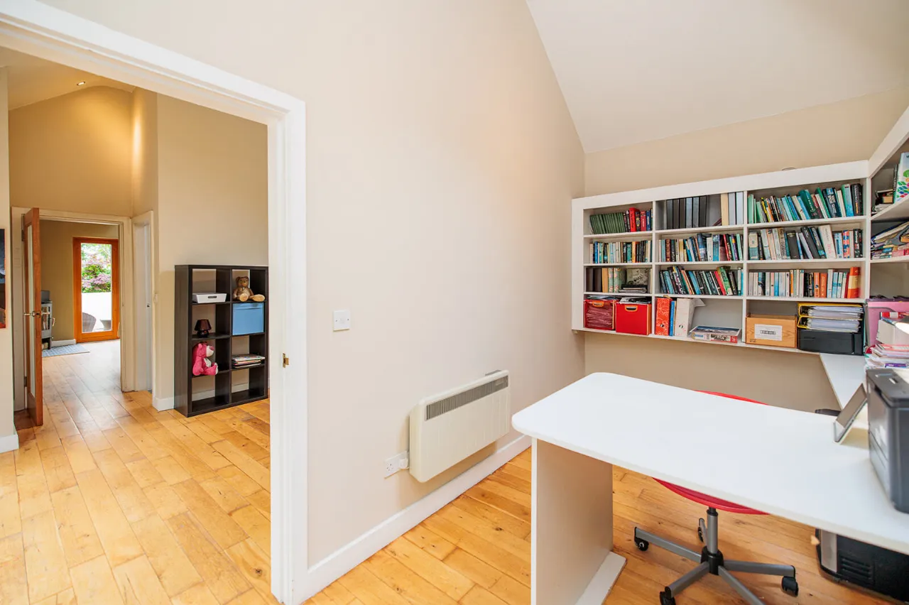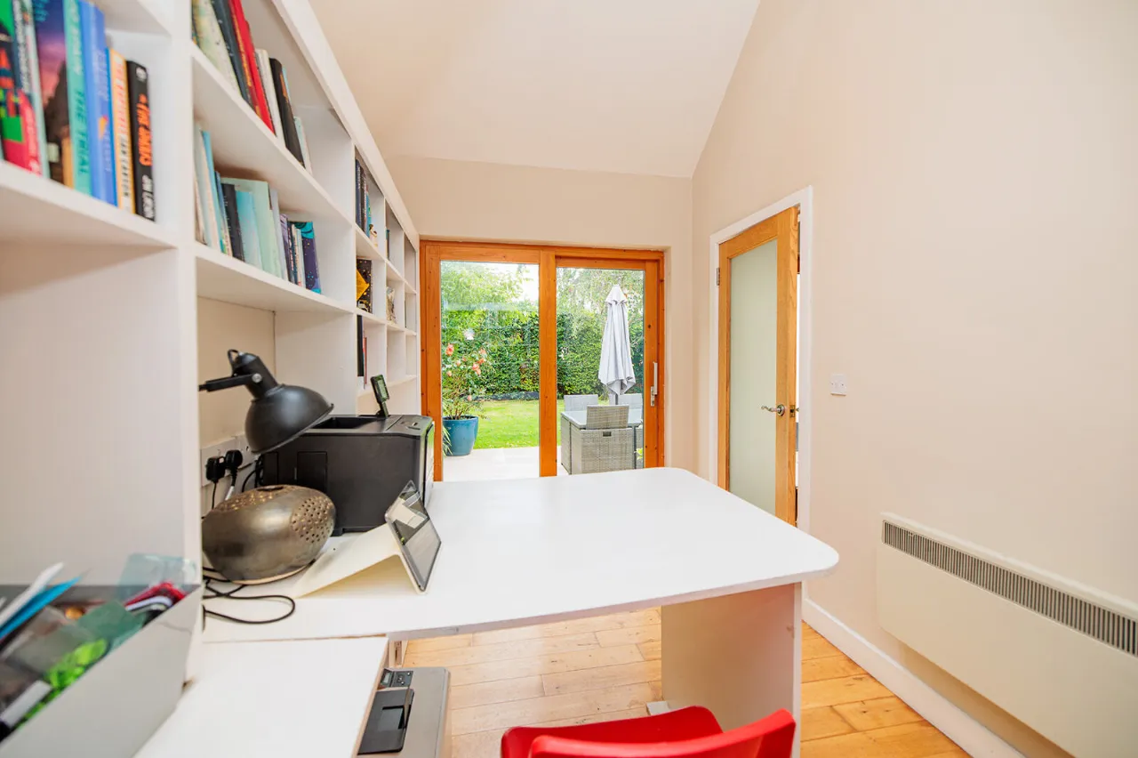 Home Office / Study 4.30m x 2.17m A dual aspect room with a sloped ceiling fitted with a Velux window in the roof to the rear of the property. A Rationel sliding patio door gives access out to the rear garden. Built-in bookcases with underneath storage cupboards and office desk. Solid Oak floor.