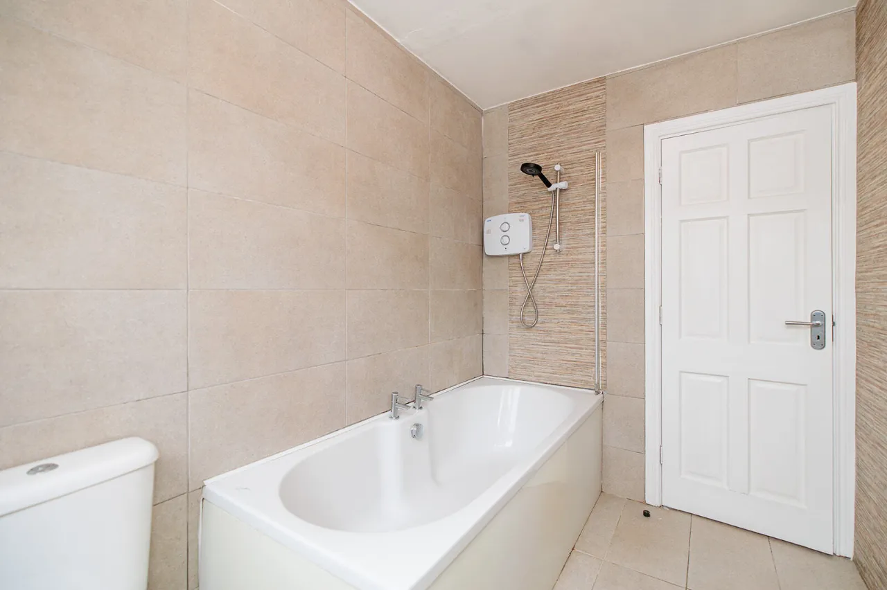 Bathroom 1.80m x 3.03m Comprising a bath fitted with a Triton T90sr pumped electric shower. WC and wash hand basin with overhead wall mounted mirror. Fully tiled walls and floor. Sloped ceiling with Velux window fitted in the roof to the rear.