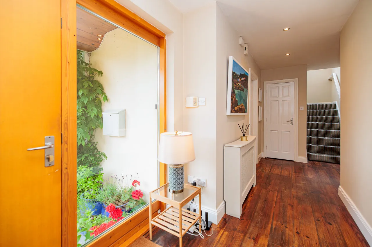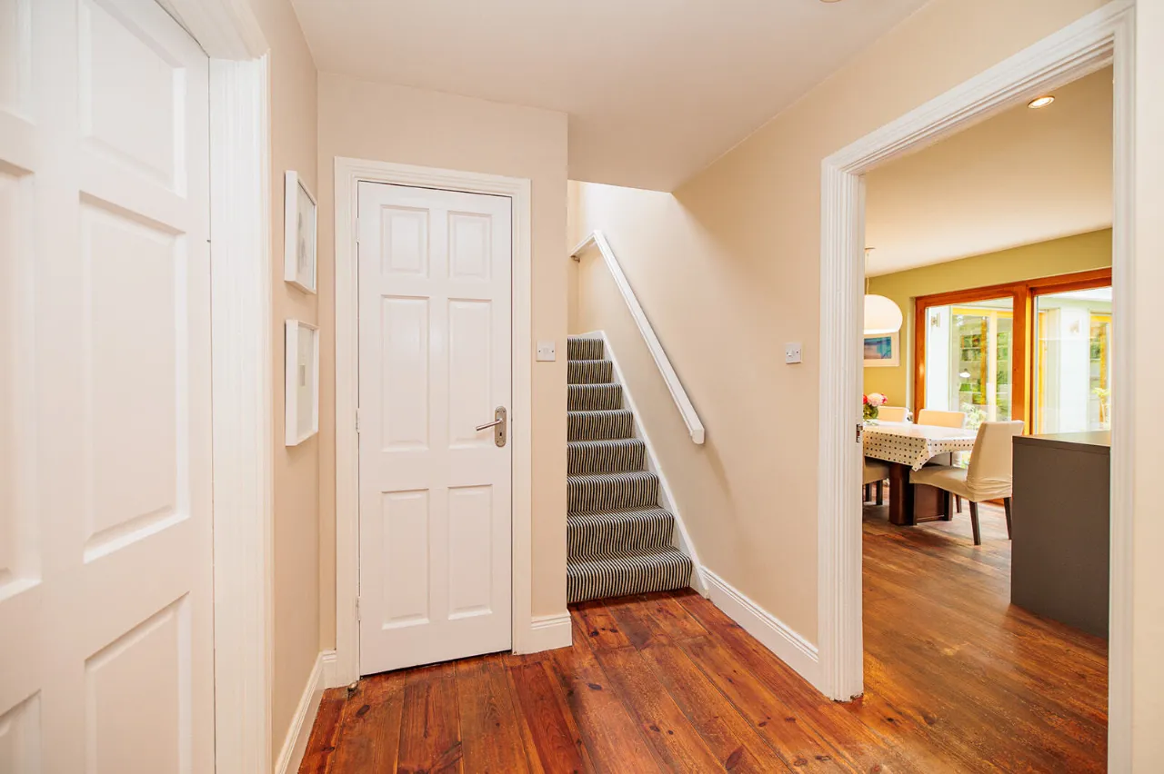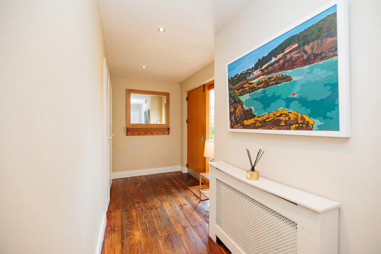 Entrance Hall (including stairs) 5.66m x 1.28m + 4.46m x 0.60m A Rationel front door with a large glass panel opens into a spacious and bright entrance hall. Wide plank solid wood floor, recessed lighting and radiator cover.