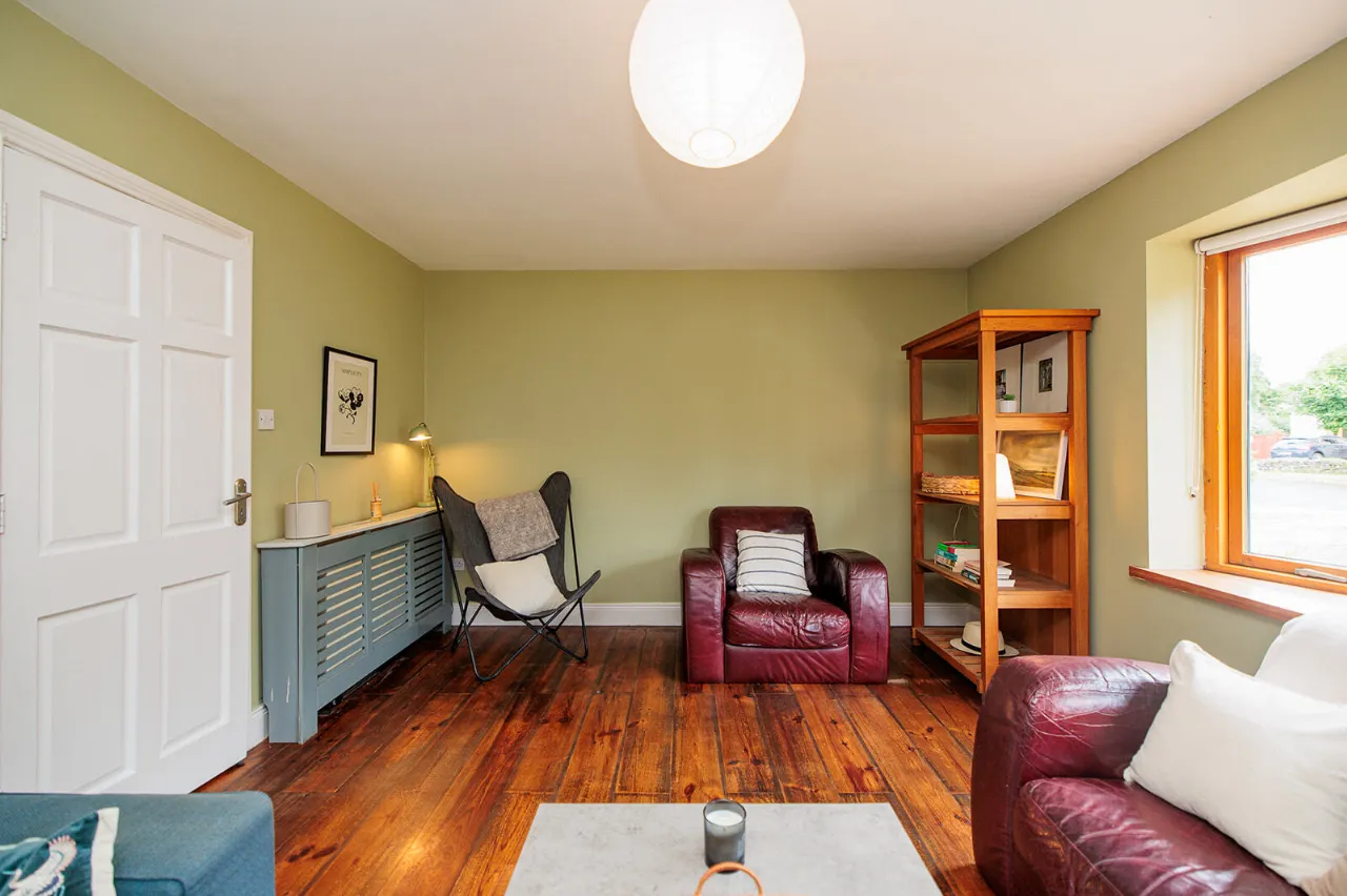 Sitting Room 5.89m x 3.66m A large and light-filled room with a feature cantilevered bay window overlooking the front garden and driveway. Open fireplace with a painted wooden surround, black Marble insert and hearth, fitted with a Waterford Stanley multi-fuel stove. Both alcoves on either sides of the chimney breast are fitted with floating shelving. Wide plank solid wood floor. Radiator cover.