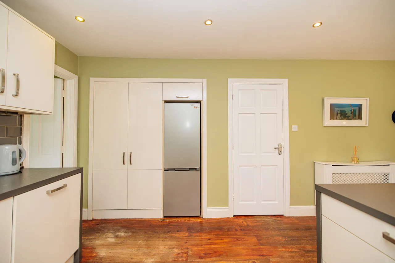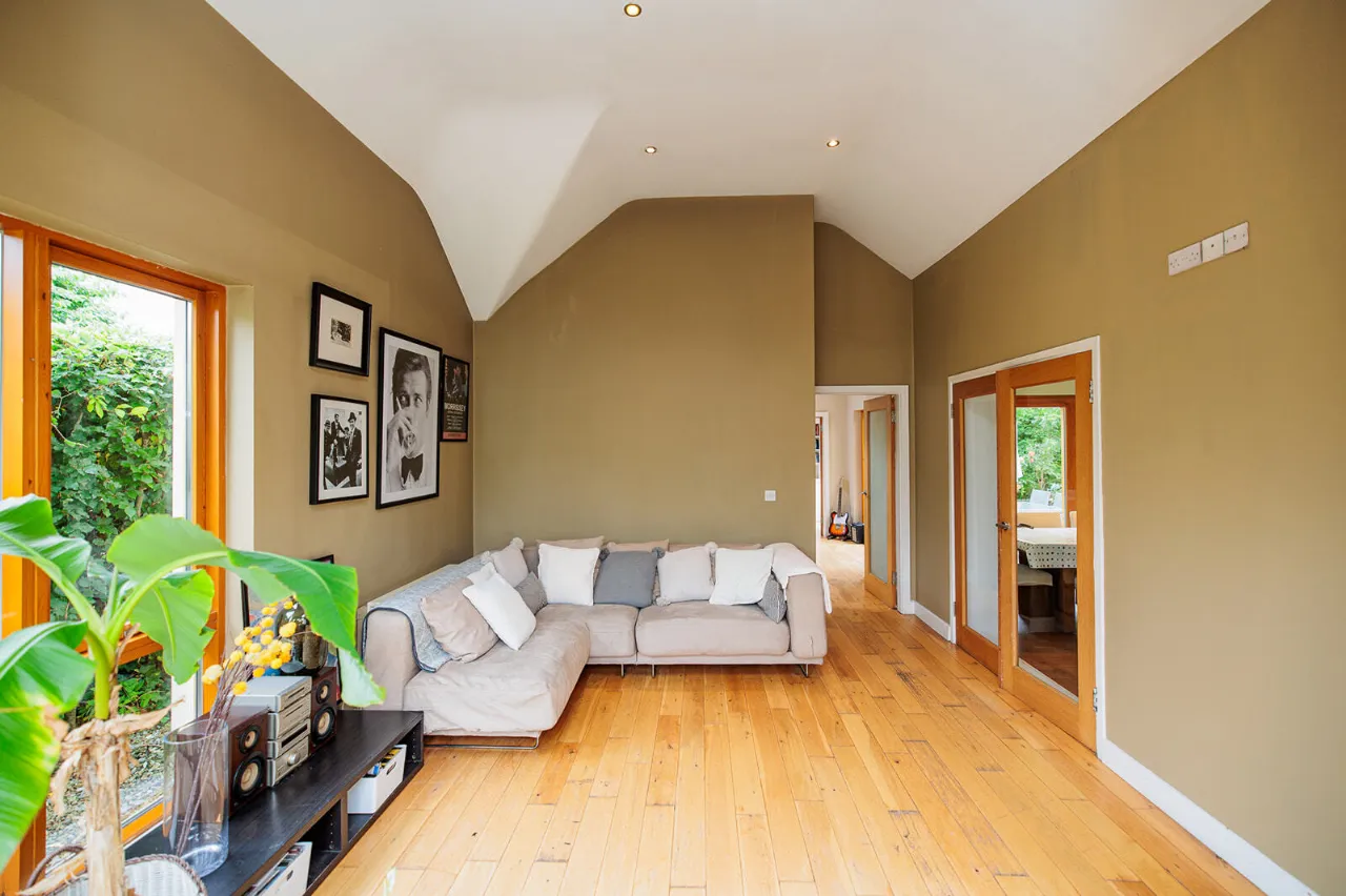 Kitchen Dining Room 6.45m x 3.39m + 1.60m x 0.61m A fine-sized and bright open plan room with lovely views of the rear garden. The kitchen area is fitted with high gloss wall and floor units with tiled backsplash, 1.5 bowl kitchen sink, composite countertops and pull-out bins. Zanussi freestanding electric cooker and Bosch stainless steel cooker hood. Bosch dishwasher and Sharp fridge/freezer. Window overlooking the rear garden. The dining area can accommodate a large table and chairs for family dining and entertaining. A Rationel sliding patio door gives access out to the rear garden. Wide plank solid wood floor and recessed lighting throughout. Radiator cover. Double glass panel doors open through to the living room.