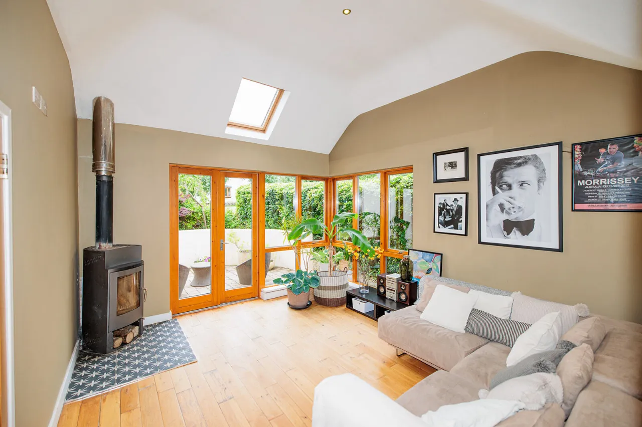 Living Room 3.78m x 4.25m + 0.99m x 0.58m Impressive and spacious light-filled dual aspect room with a feature high sloped ceiling and large corner window. Rationel French doors open out to a sun-drenched patio. Solid oak floor and recessed ceiling lighting. Haas + Sohn log burner.