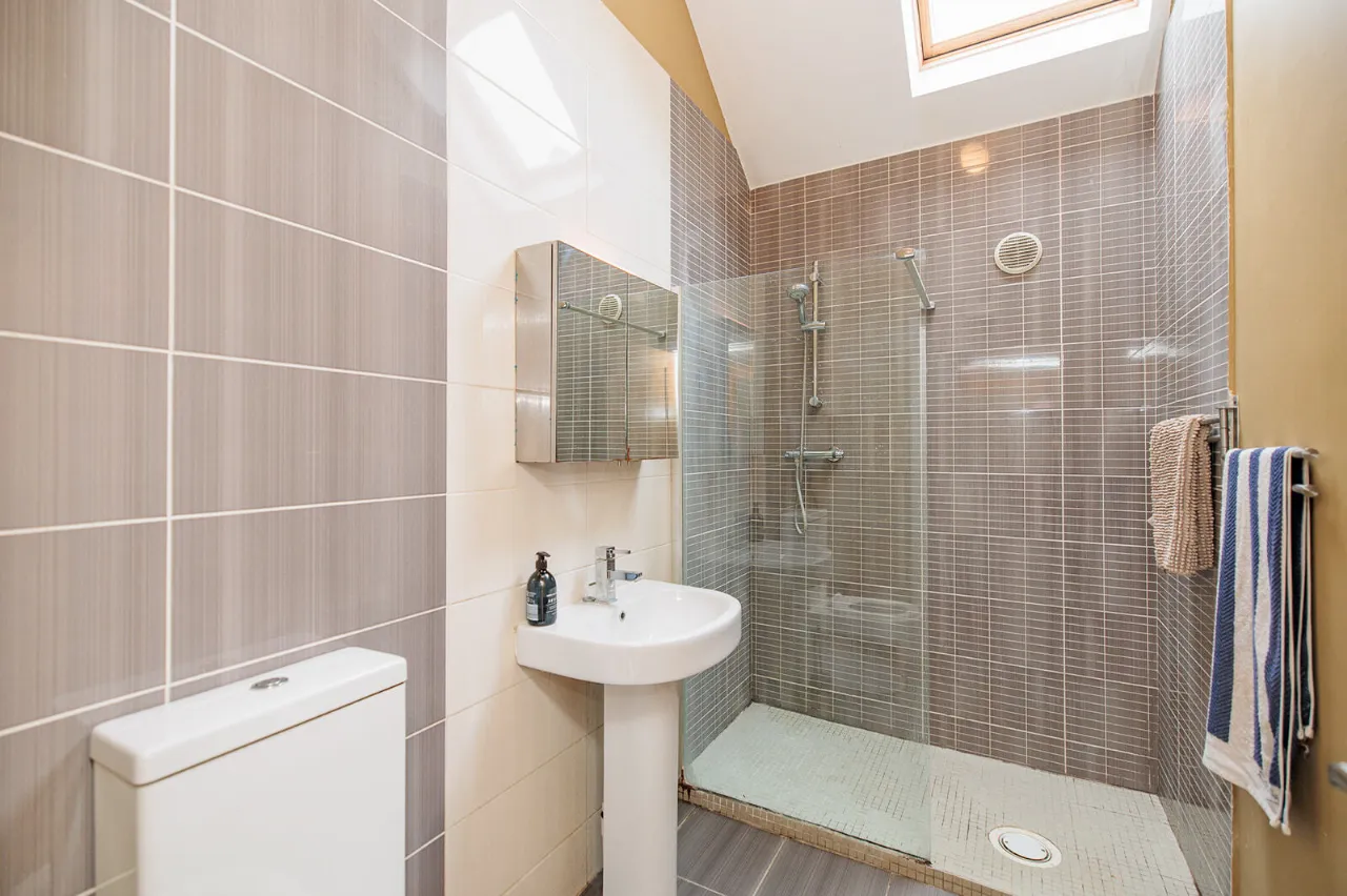 En-Suite 2.65m x 1.58m Comprising a walk-in wet room shower with glass panel. WC and wash hand basin with wall mounted mirrored cabinet. High sloped ceiling fitted with a Velux window. Extractor fan and Dimplex wall mounted downflow fan heater. Tiled floor and part tiled walls.