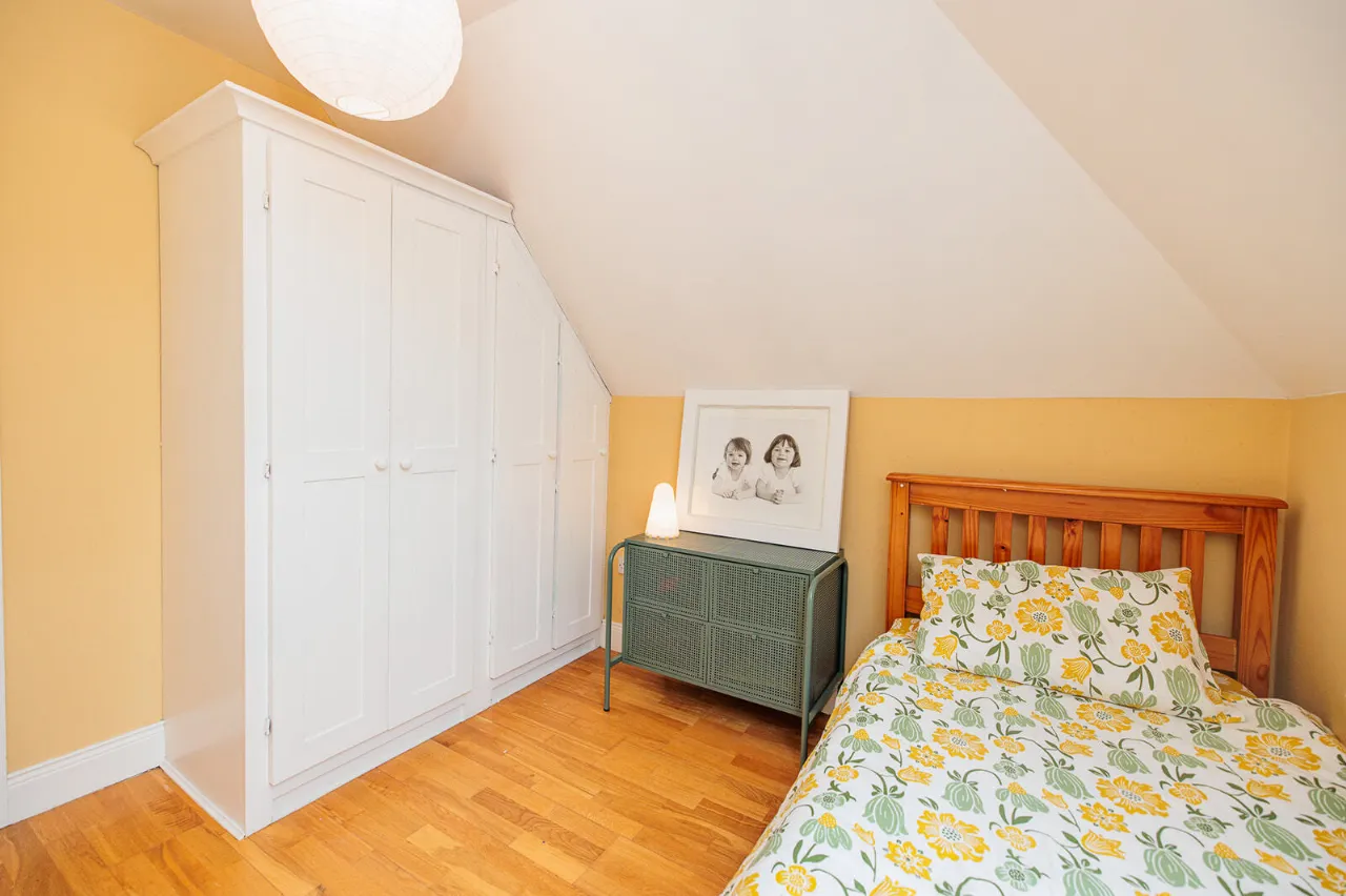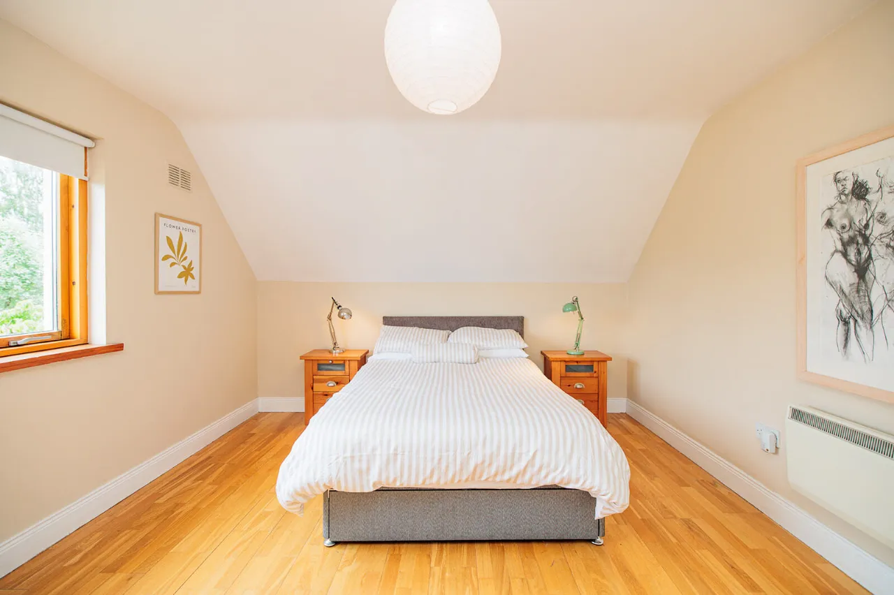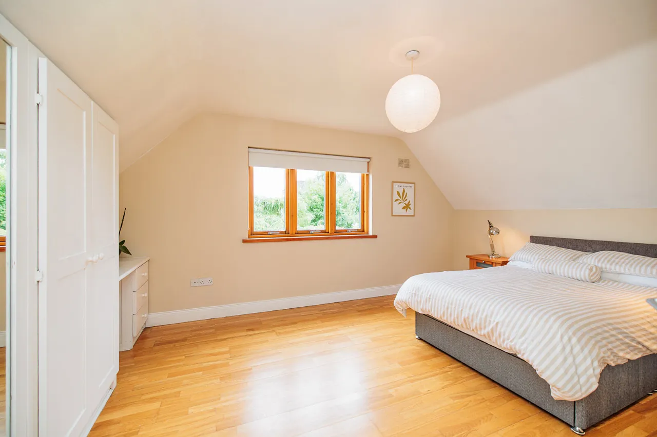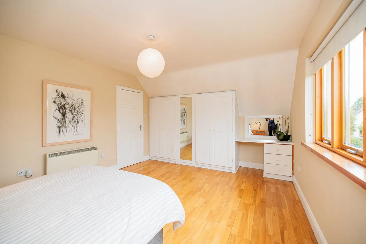 Bedroom One 5.06m x 3.67m A fine-sized and bright double bedroom positioned to the front of the property. Sloped ceiling and semi-solid Oak floor. Built-in wardrobes and dressing table with underneath storage drawers.
