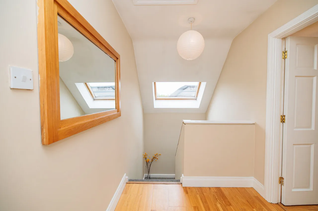 Landing (including stairs) 4.86m x 0.78m + 5.25m x 1.12m A spacious and bright landing with a large sunny west-facing Velux window over the staircase. Semi-solid Oak floor and fitted carpet on the stairs. Hatch to attic space.