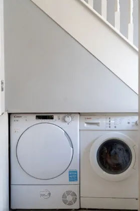 Entrance Hall (including stairs) 2.14m x 2.61m A striking glass panel front door with large side panel opens into a smart and welcoming entrance hall. The front door and side panel are fitted with Plantation Shutters. Tiled floor and coat hanging space. Staircase up to first floor level. The closet under the staircase is plumbed for a washing machine and has space for a tumble dryer.