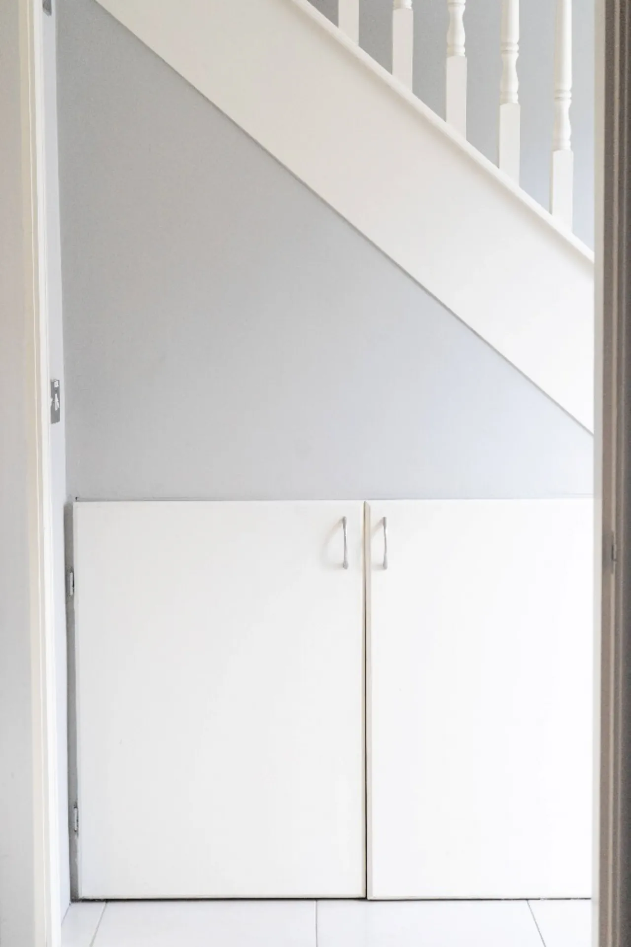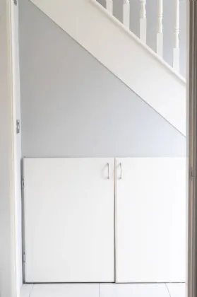 Entrance Hall A striking glass panel front door with large side panel opens into a smart and welcoming entrance hall. The front door and side panel are fitted with Plantation Shutters. Tiled floor and coat hanging space. Staircase up to first floor level. The closet under the staircase is plumbed for a washing machine and has space for a tumble dryer.
