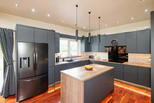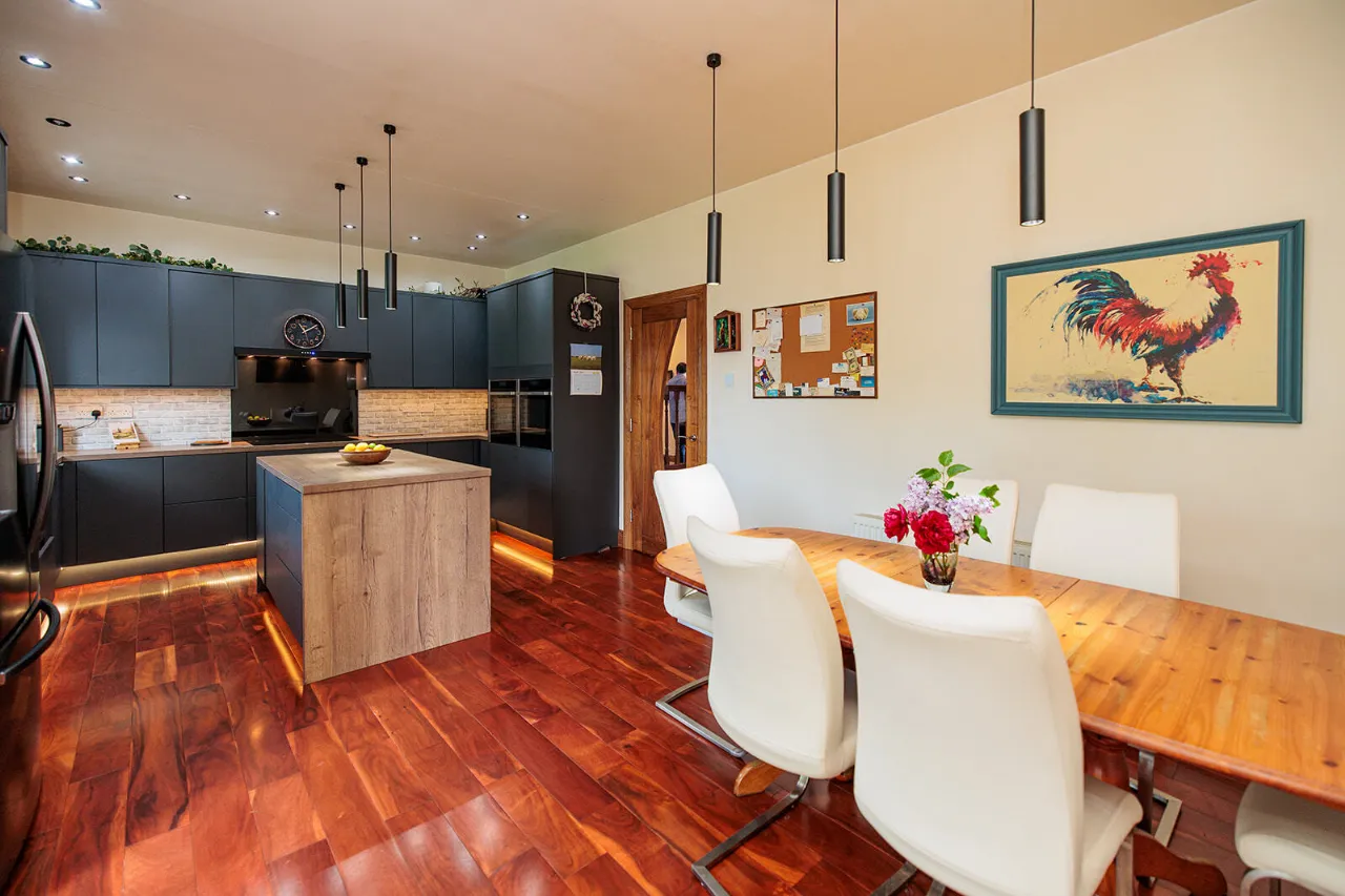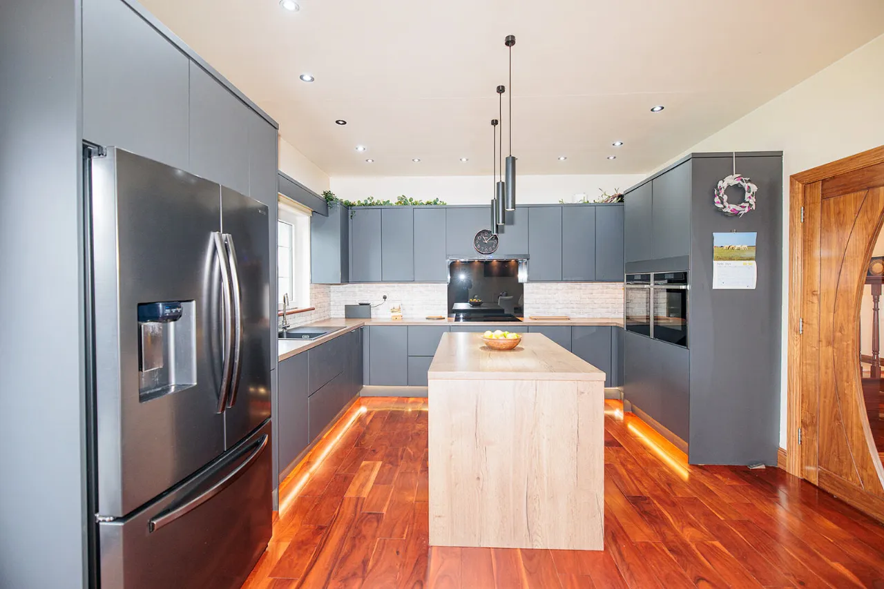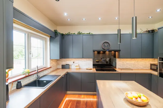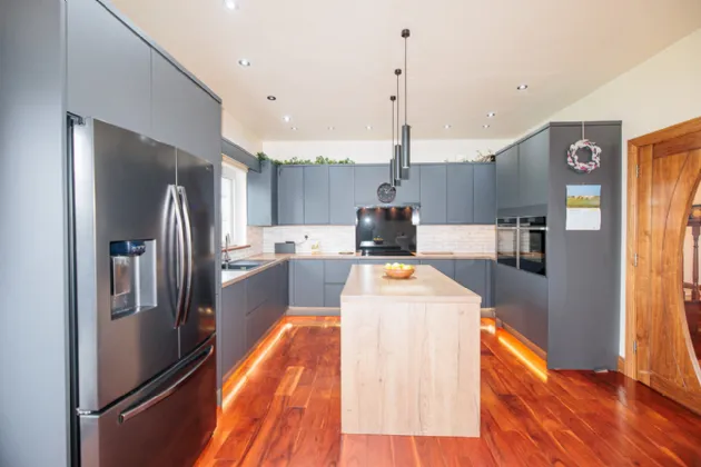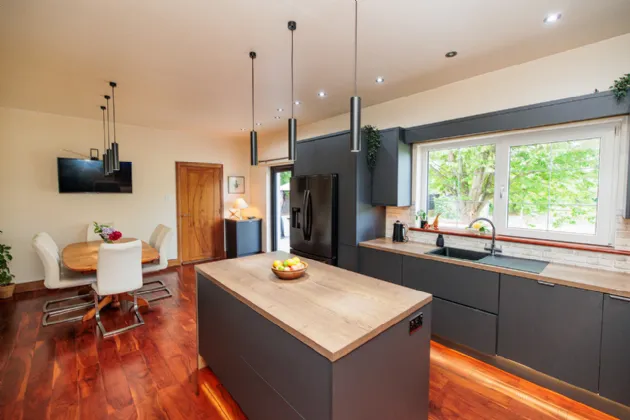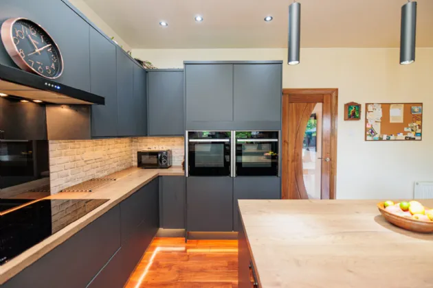 Kitchen /Breakfast Room 6.83m x 4.12m A sun-drenched open plan room with views of the rear garden. The kitchen area is fitted with Anthracite Grey fitted wall and floor units with wooden countertops. Two Neff electric ovens and induction hob. Black coloured extractor fan. Nordmende integrated dishwasher. Alcove for American fridge/freezer. West-facing window to the rear. Built-in bins and strip lighting under the floor units. Matching centre island with plenty of underneath storage and wooden countertop. The breakfast area has plenty of space for a table and chairs for family dining. Solid Walnut flooring and recessed ceiling lighting throughout. French doors open out to the patio area and rear garden from the breakfast area.