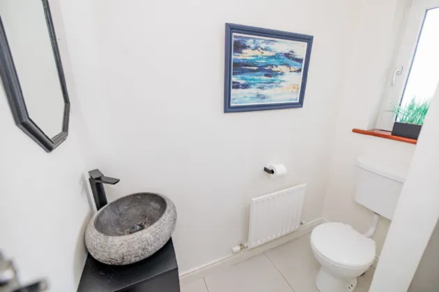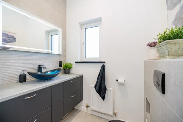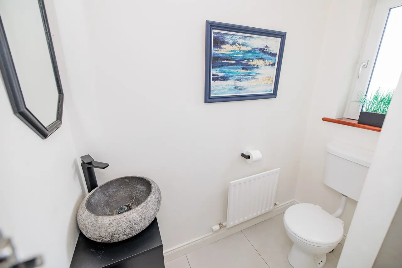 Guest WC 2.00m x 0.89m Comprising WC and vanity unit with a glass round wash hand basin. Tiled flooring and south-facing gable end window.