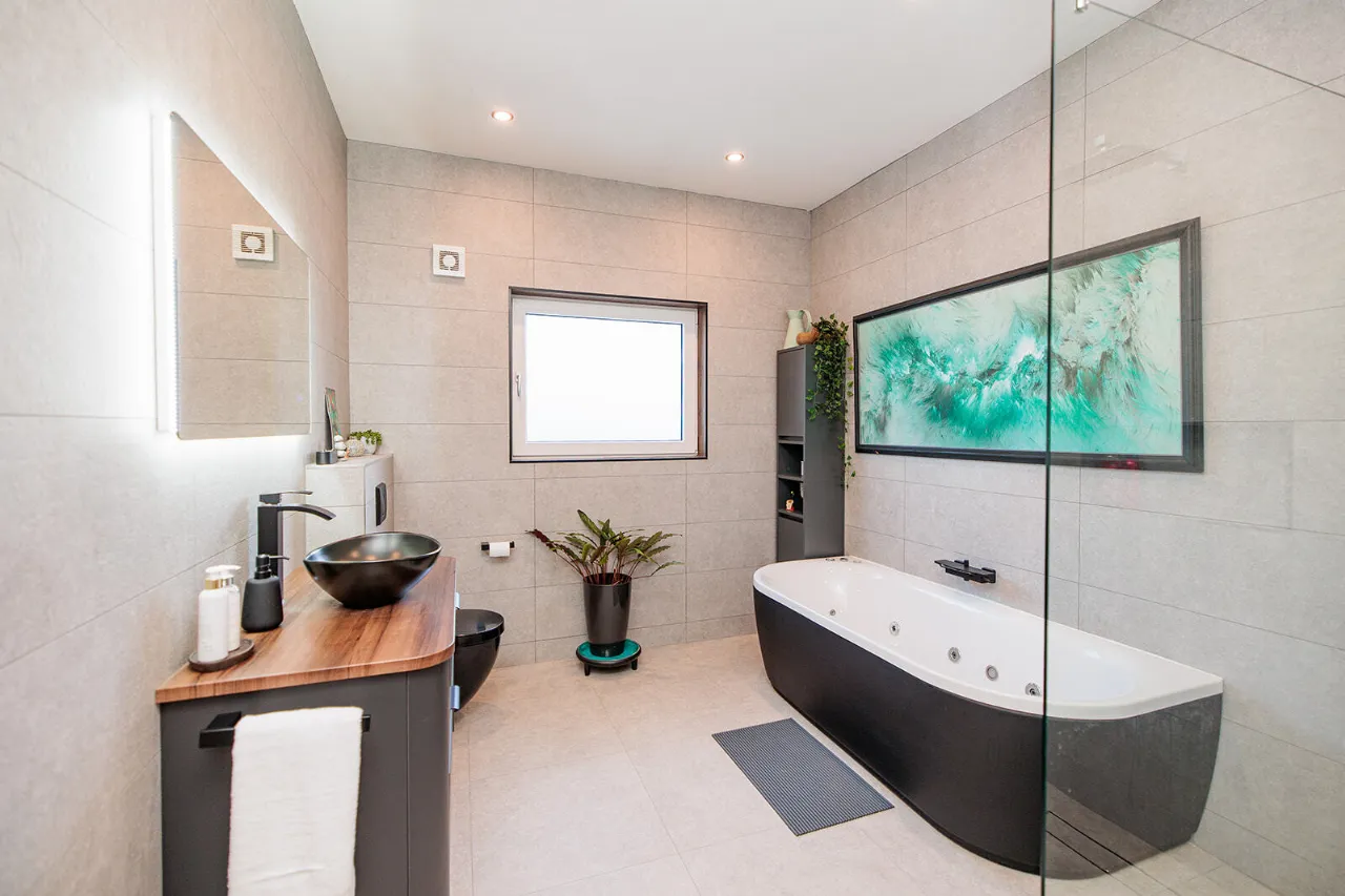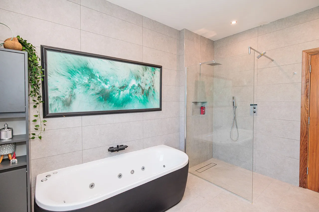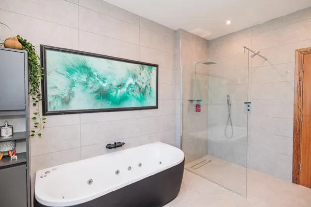 Bathroom 3.59m x 2.69m Comprising a freestanding back to wall double ended spa bath with a wall mounted mixer tap. Walk-in wet room shower with glass enclosure, rain shower head and hand-held attachment. WC with built-in flush plate and wall mounted vanity unit with oval Porcelain wash hand basin with underneath storage drawers and worktop. LED wall mounted mirror. Chrome flat towel radiator. Fully tiled walls and floor. Frosted gable end window, recessed ceiling lighting and extractor fan. 9ft high ceiling.