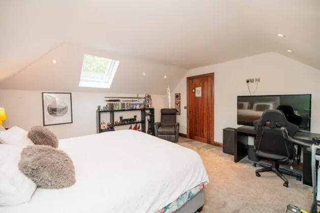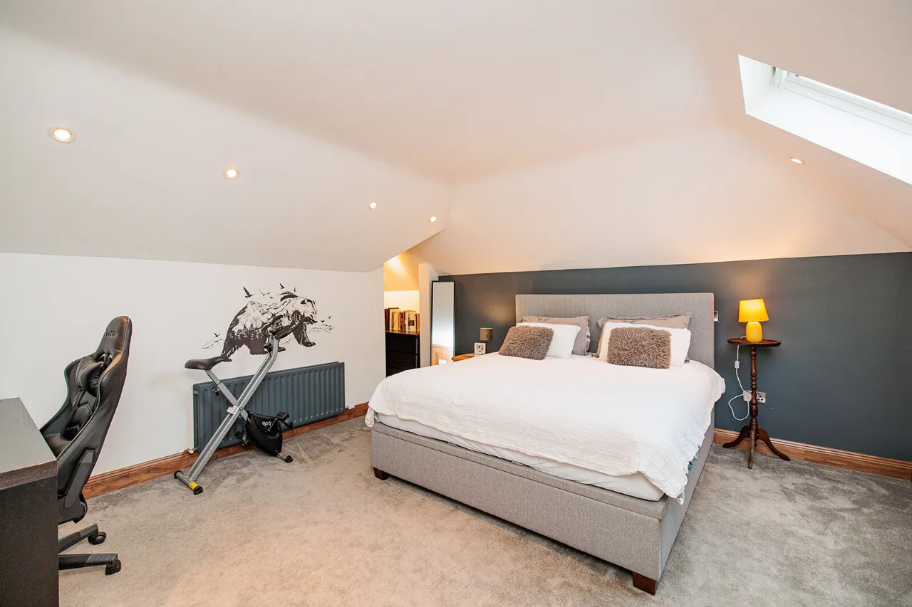 Attic Room One 4.47m x 4.22m A spacious and light filled area with a west-facing remote controlled sensor Velux window fitted in the roof to the rear. Recessed ceiling lighting and fitted carpet flooring.