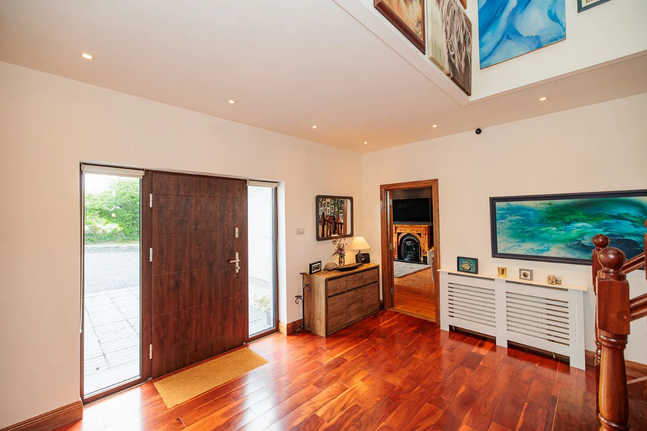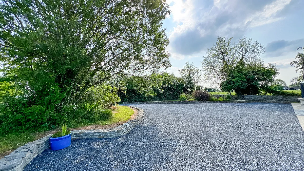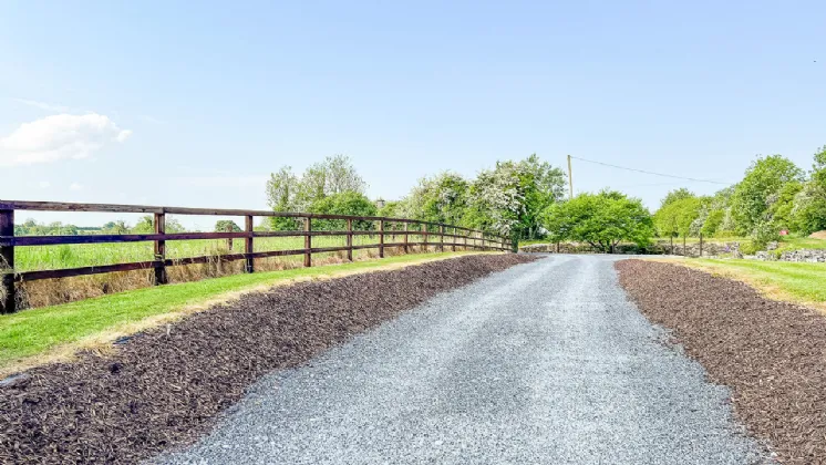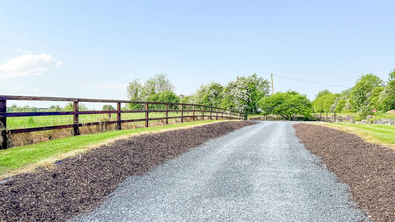 Rathduff Lodge sits peacefully on circa 1 Acre / 0.4 Hectares of mature and secluded gardens. The property is set well back from the road and is accessed by a sweeping chip stone driveway, flanked by lawns with mature trees and post and rail fencing on one side. There is parking to the front, side and rear of the house for several cars.