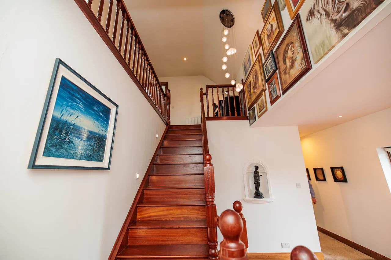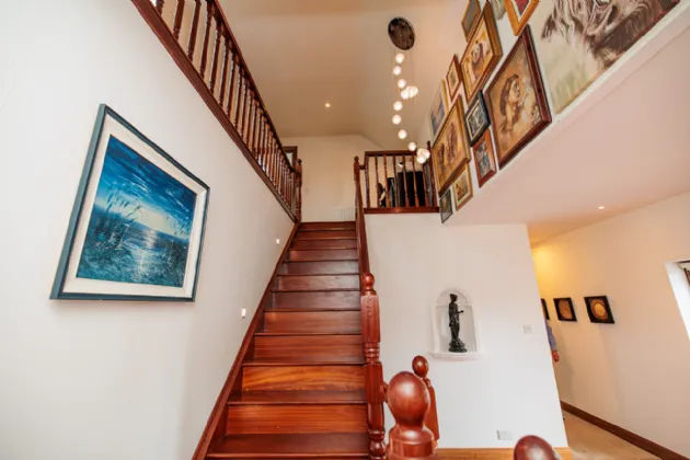 Entrance Hall 4.49m x 4.24m + 3.21m x 1.00m A premium Composite steel front door with glass side panels opens into a grand and spacious entrance hall. Solid Walnut flooring, ceiling coving and recessed ceiling lighting. Impressive Teak wood L-shaped staircase up to first floor level. 9ft high ceiling.