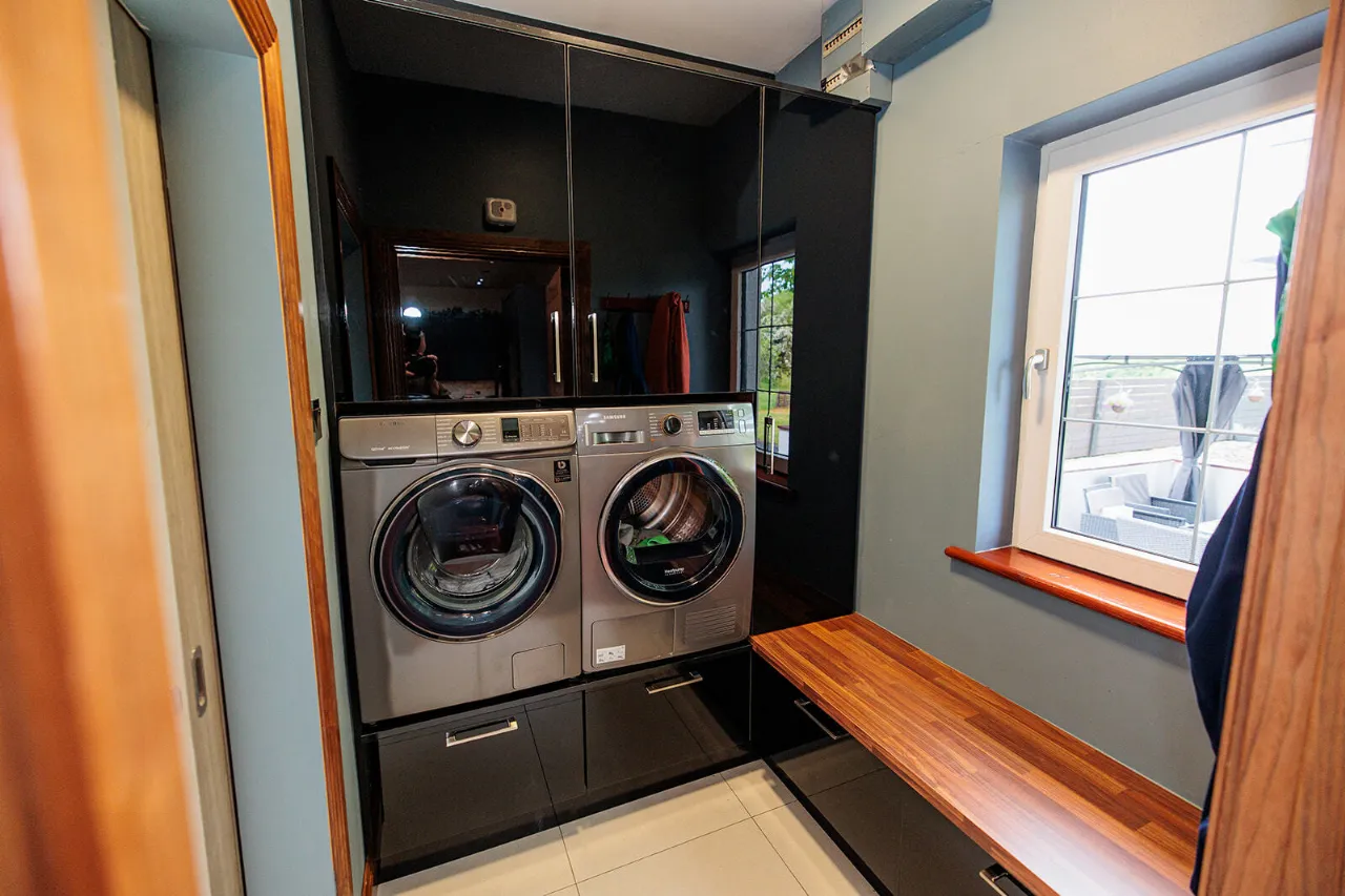 Utility Room 1.69m x 1.88m Fitted with Black high-gloss floor to ceiling cupboards. Plumbing in in place for a washing and space for a tumble dryer. Built-in seating with underneath storage drawer. Window to the rear and coat hanging space. Tiled flooring and 9ft high ceiling. Sliding Pocket Doors to Guest WC.