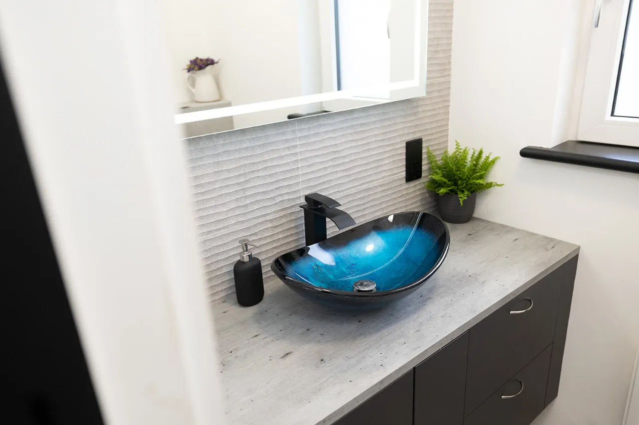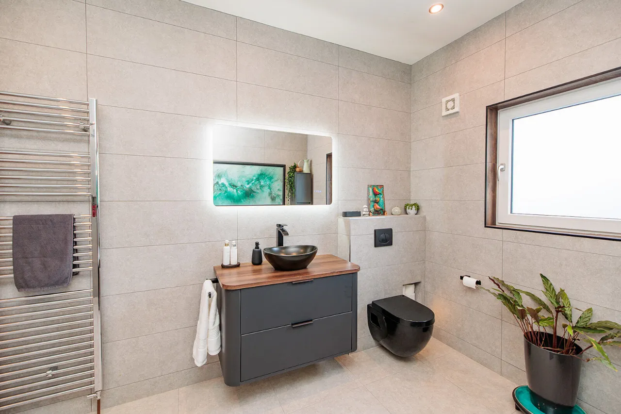 WC 1.39m x 1.91m Comprising a WC with built-in flush plate. Wall mounted vanity unit with oval Porcelain wash hand basin with worktop and underneath storage cupboards. Feature tiled wall over the vanity unit fitted with a Wall mounted LED mirror. Tiled flooring and frosted gable end window.