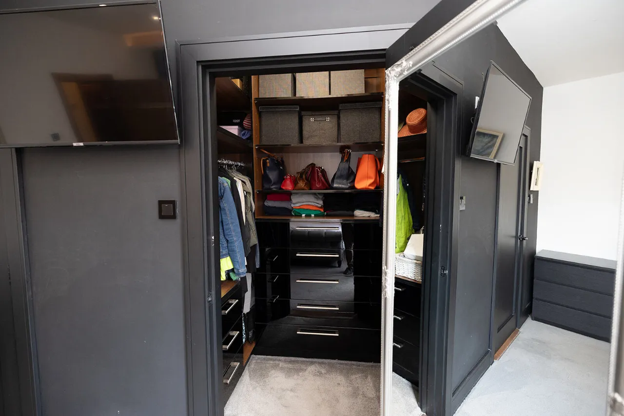 Walk-in Wardrobe 2.08m x 1.37m Fitted with floor to ceiling hanging space, shelving and storage drawers. Fitted carpet flooring and overhead radiator.