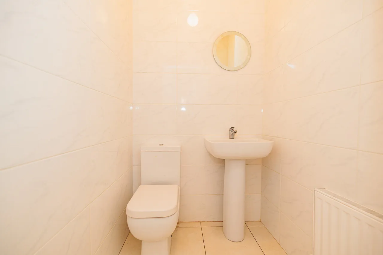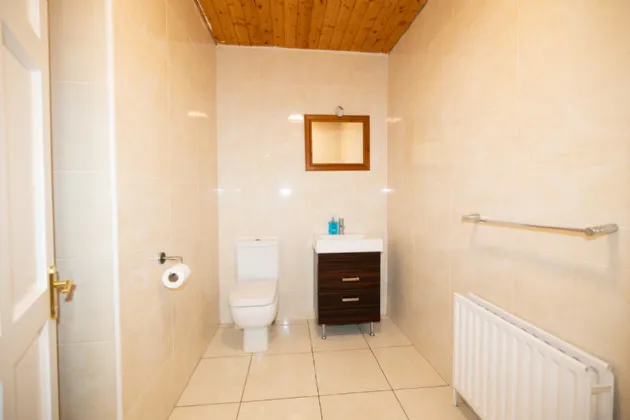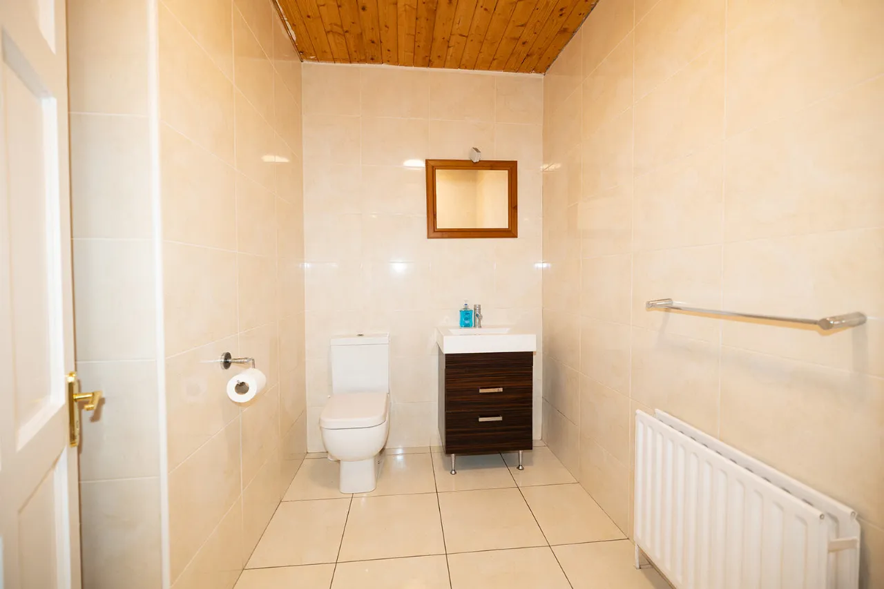Guest WC 1.29m x 1.37m Comprising WC and wash hand basin. Fully tiled walls and floor. Stained tongue and groove ceiling boards.