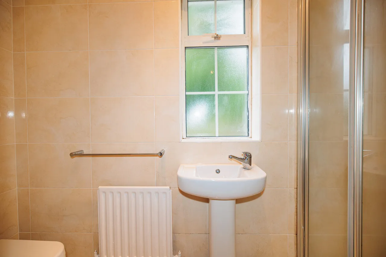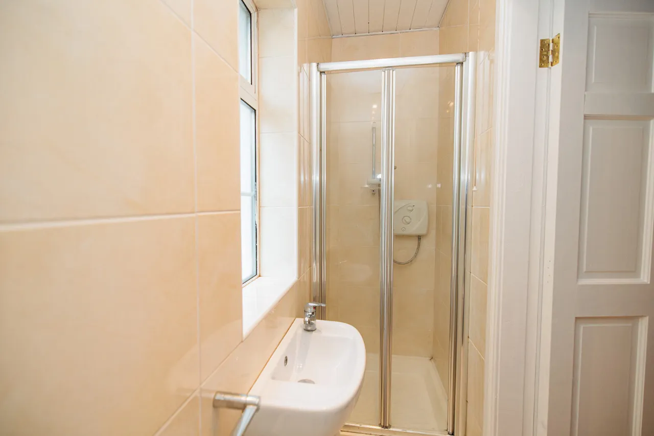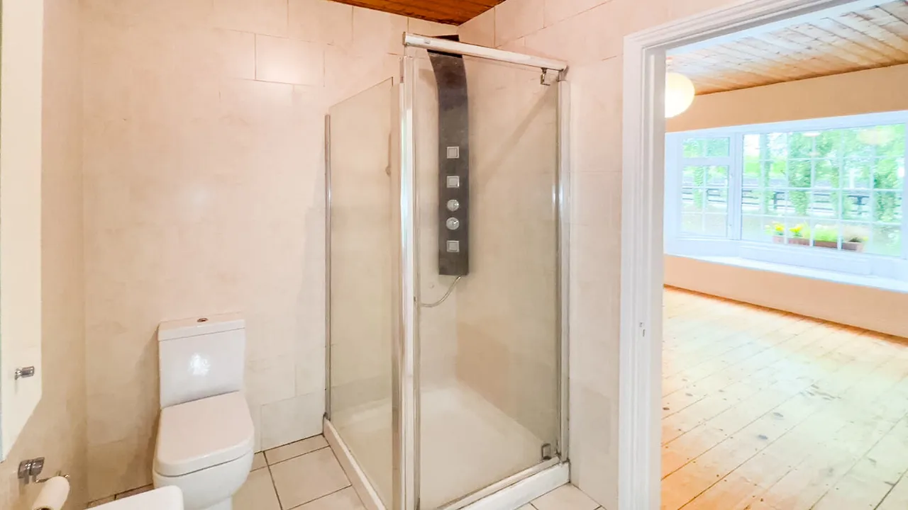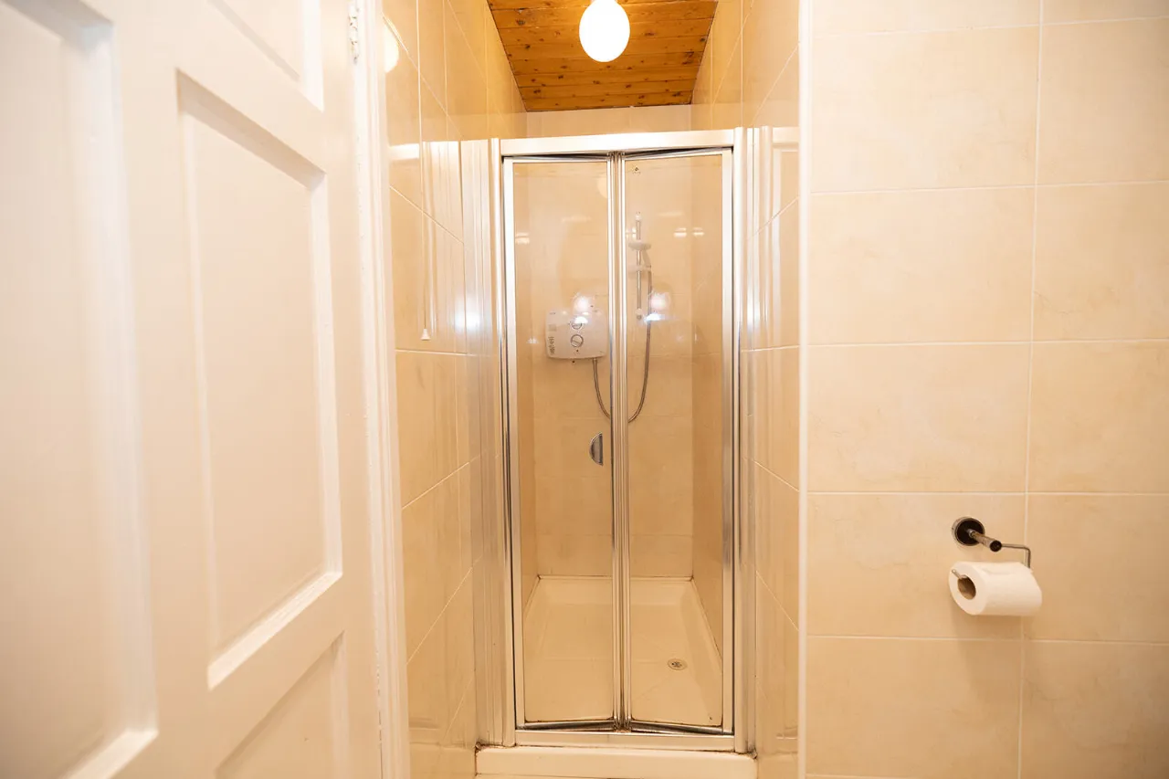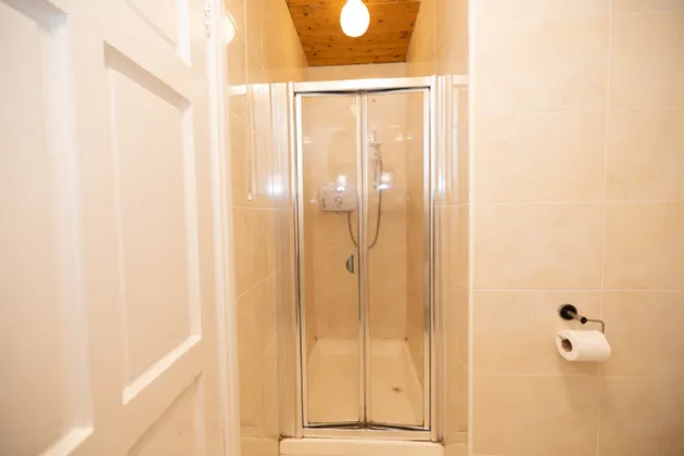 En-Suite 2.28m x 1.62m + 1.51m x 0.83m Comprising an enclosed shower cubicle fitted with a Triton T90sr pumped electric shower. WC and vanity unit with underneath storage. Fully tiled walls and floor. Stained tongue and groove floorboards. Extractor fan.