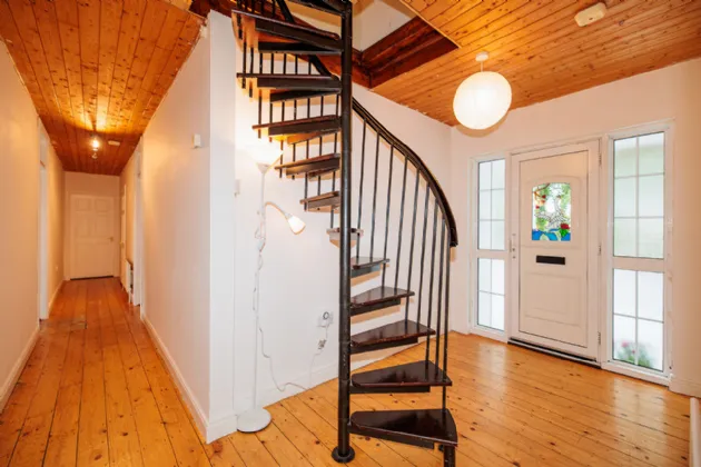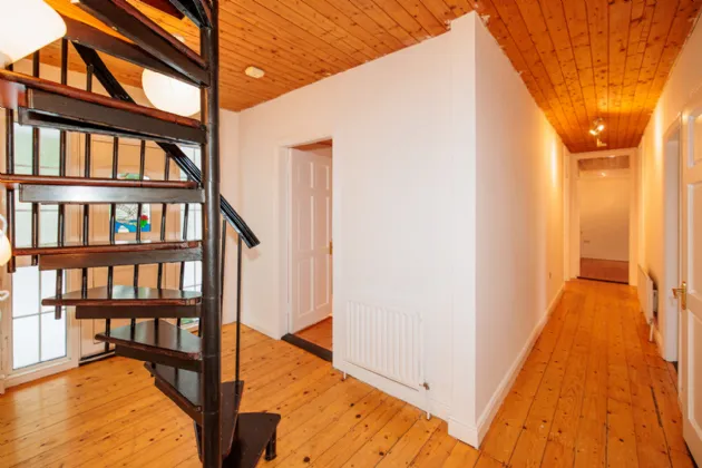 Entrance Hall 2.91m x 2.13m + 15.68m x 1.01m A PVC front door with stained glass insert and frosted glass side panels opens into a spacious and welcoming T-shaped entrance hall. Stained tongue and groove floorboards and ceiling boards. Spiral Staircase up to attic space.