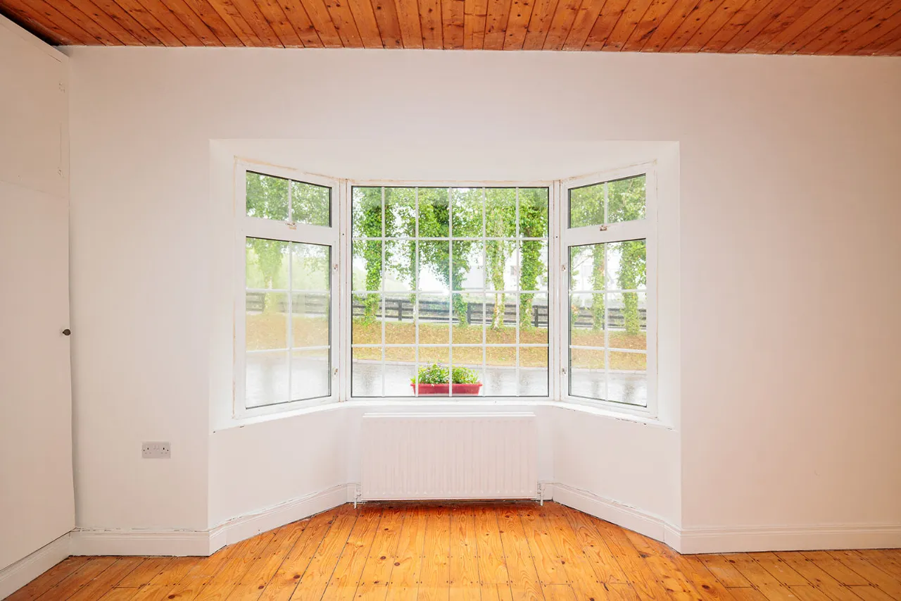 Bedroom Four 4.02m x 3.91m + 2.41m x 0.71m A generous-sized double bedroom with a feature bay overlooking the front of the property. Dual built-in wardrobes with dressing table. Stained tongue and groove floorboards and ceiling boards.